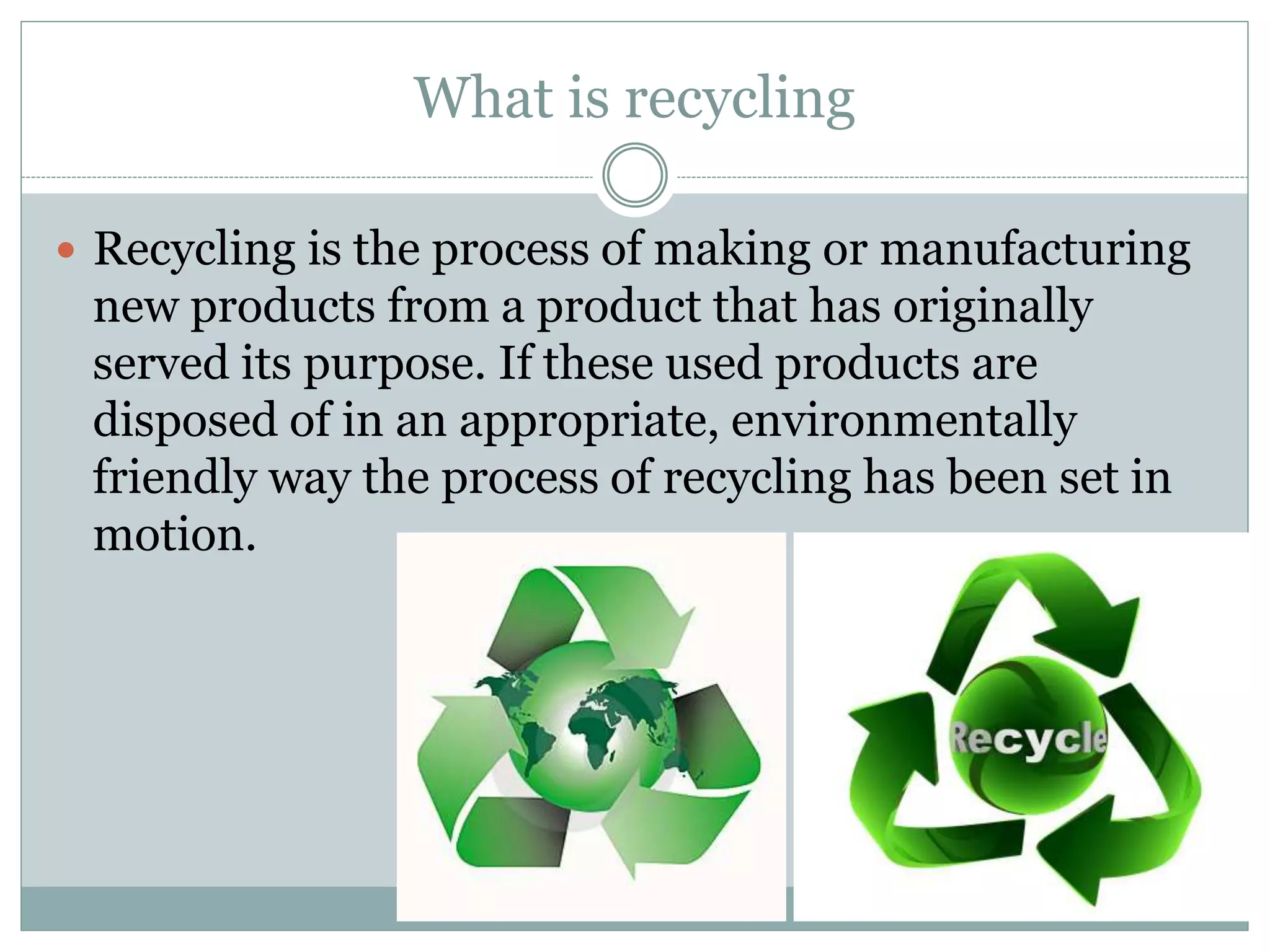 Recycling is the process of making new products from used materials. It has been practiced for thousands of years but became more widespread during times of war and economic hardship. Recycling is important because it conserves natural resources, saves energy, reduces pollution, and creates jobs. Common recyclable items include paper, glass, aluminum, steel, and some plastics. Recycling these materials helps reduce the need for raw materials and energy in manufacturing. Proper recycling reduces waste in landfills and pollution in the environment.