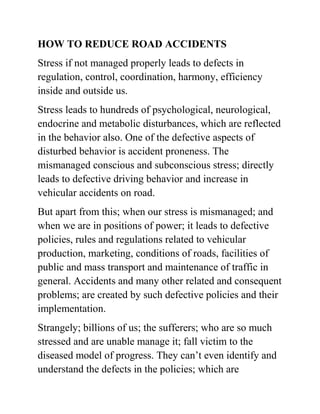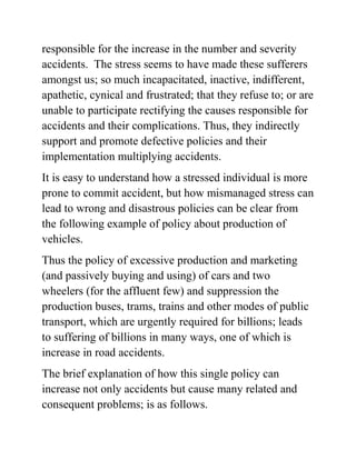 The document discusses how mismanaged stress can lead to increased road accidents. It states that stress can cause defective behaviors and policies related to vehicle production, infrastructure, and traffic management. Specifically, it argues that policies favoring excessive private vehicle production over public transportation have led to overcrowded roads, pollution, accidents, and other issues by placing too much burden on the transportation system. The document advocates improving public transit as an immediate solution to reduce accidents and presents stress management as a holistic approach to addressing the root causes.