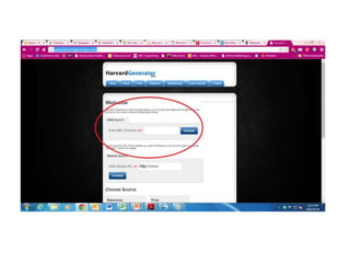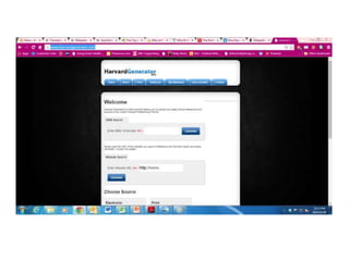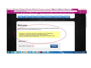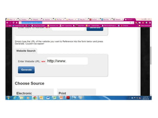 This document provides guidance on how to reference different sources such as books and websites in academic writing. It explains what information can be found on the cover and copyright page of books. It demonstrates the structure for listing book references and provides examples of in-text citations for books with one, two, or three authors. The document also demonstrates how to reference websites, including listing the URL and including an access date.