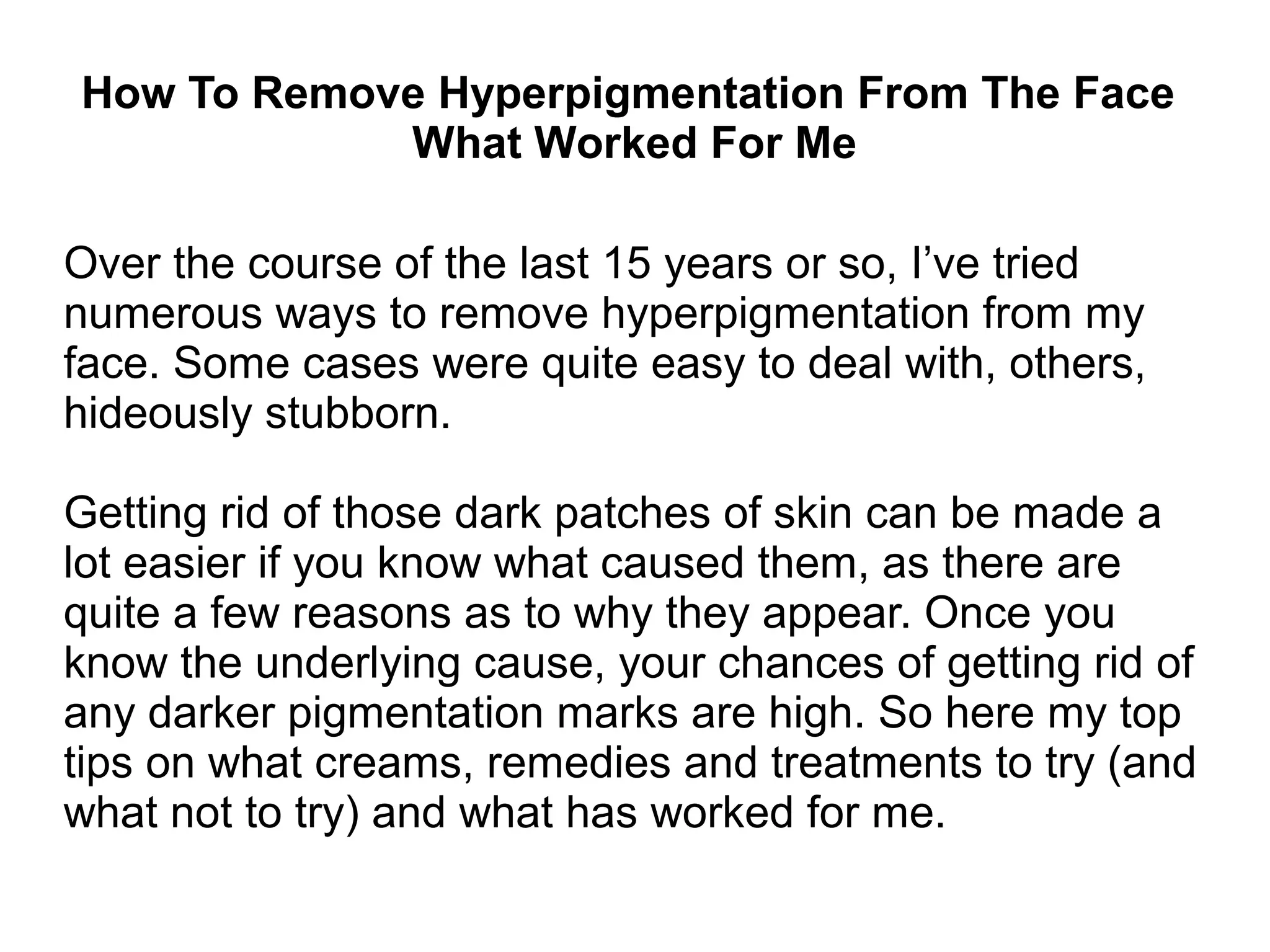 Hyperpigmentation can be caused by UV damage, acne scars, melasma, freckles, or hormonal imbalances. Addressing the underlying cause is important before treating. The author found success using a combination of natural remedies including apple cider vinegar applied daily, vitamin E oil, a natural hyperpigmentation cream, lemon or lime juice, oatmeal face masks, turmeric supplements, and a healthy diet. Sun damage faded within 2 months while acne scarring took 12-16 weeks to significantly lighten. Perseverance is key as there are no quick fixes for hyperpigmentation.