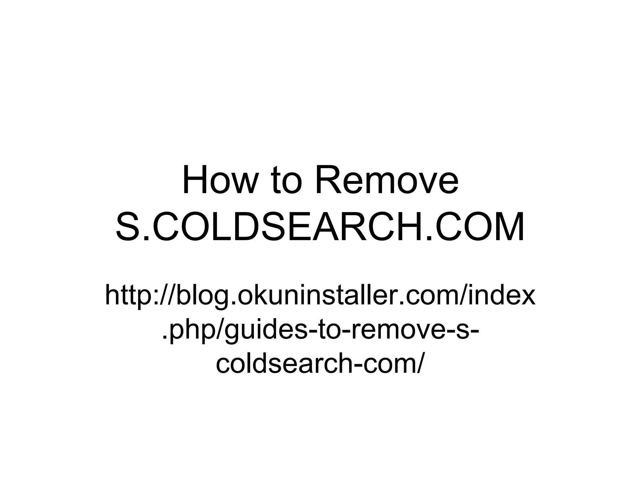 The document provides a guide on how to remove the browser hijacker s.coldsearch.com, which redirects users and tracks their browsing activities. It explains that this malware can infiltrate systems through unreliable software, leading to pop-up ads and potential data breaches. The removal process involves restarting the system in safe mode and adjusting settings in both the command prompt and the registry editor.