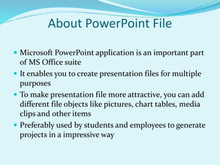 The document discusses Microsoft PowerPoint and its role in creating presentations, emphasizing the ability to enhance files with various media objects. It specifically addresses issues related to corrupted PowerPoint files and offers solutions, including the built-in 'open and repair' feature and the use of the SFware PPT Repair program for more serious corruption. It also outlines the causes of corruption, error messages, and system requirements for the repair software.