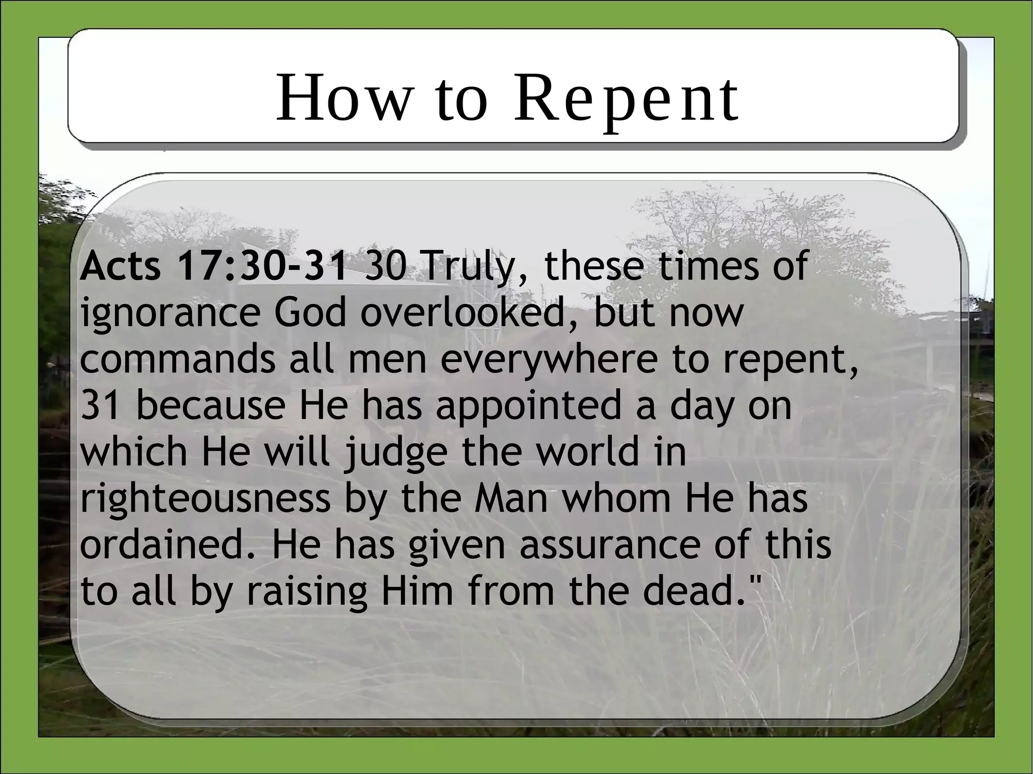 The document discusses how to repent according to the Bible. It explains that to repent, one must: 1) Realize that their current behaviors and actions are sinful and will lead to destruction, 2) Learn what God requires of them by studying the Bible, 3) Make a resolution to change their mind and follow God's teachings instead of their sinful ways, 4) Demonstrate the change through good works and right actions, and 5) Continually walk in righteousness and avoid sin going forward.