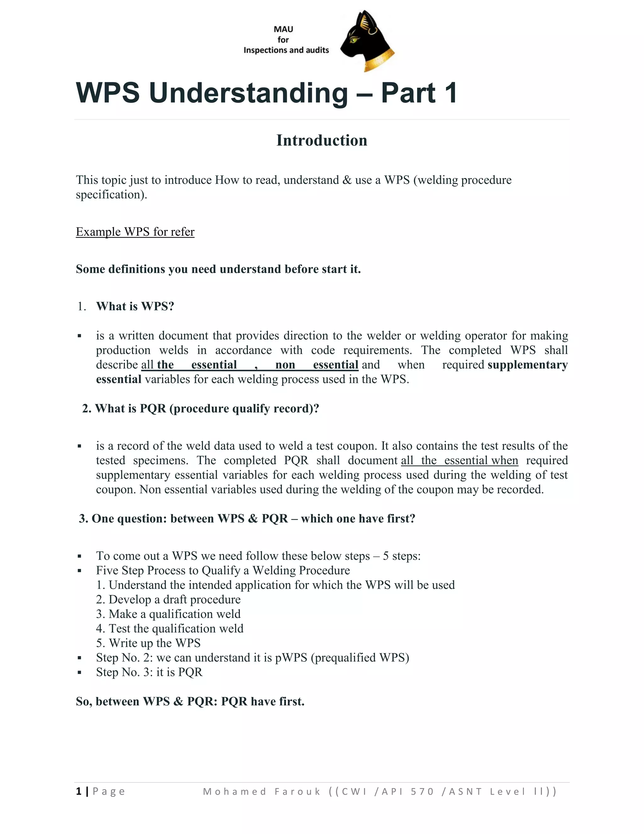 1) The document discusses how to read, understand, and use a Welding Procedure Specification (WPS). It provides definitions for key terms like WPS, PQR, essential variables, and non-essential variables.