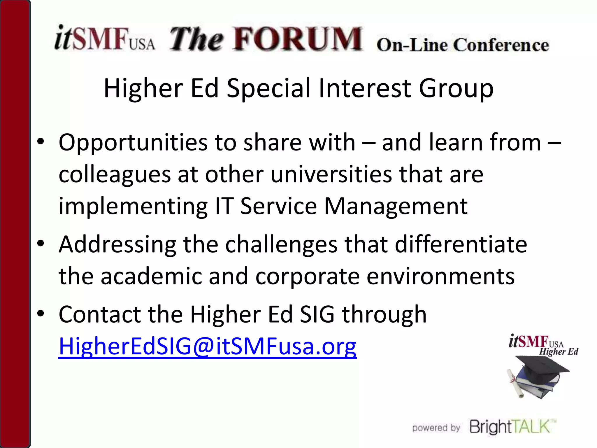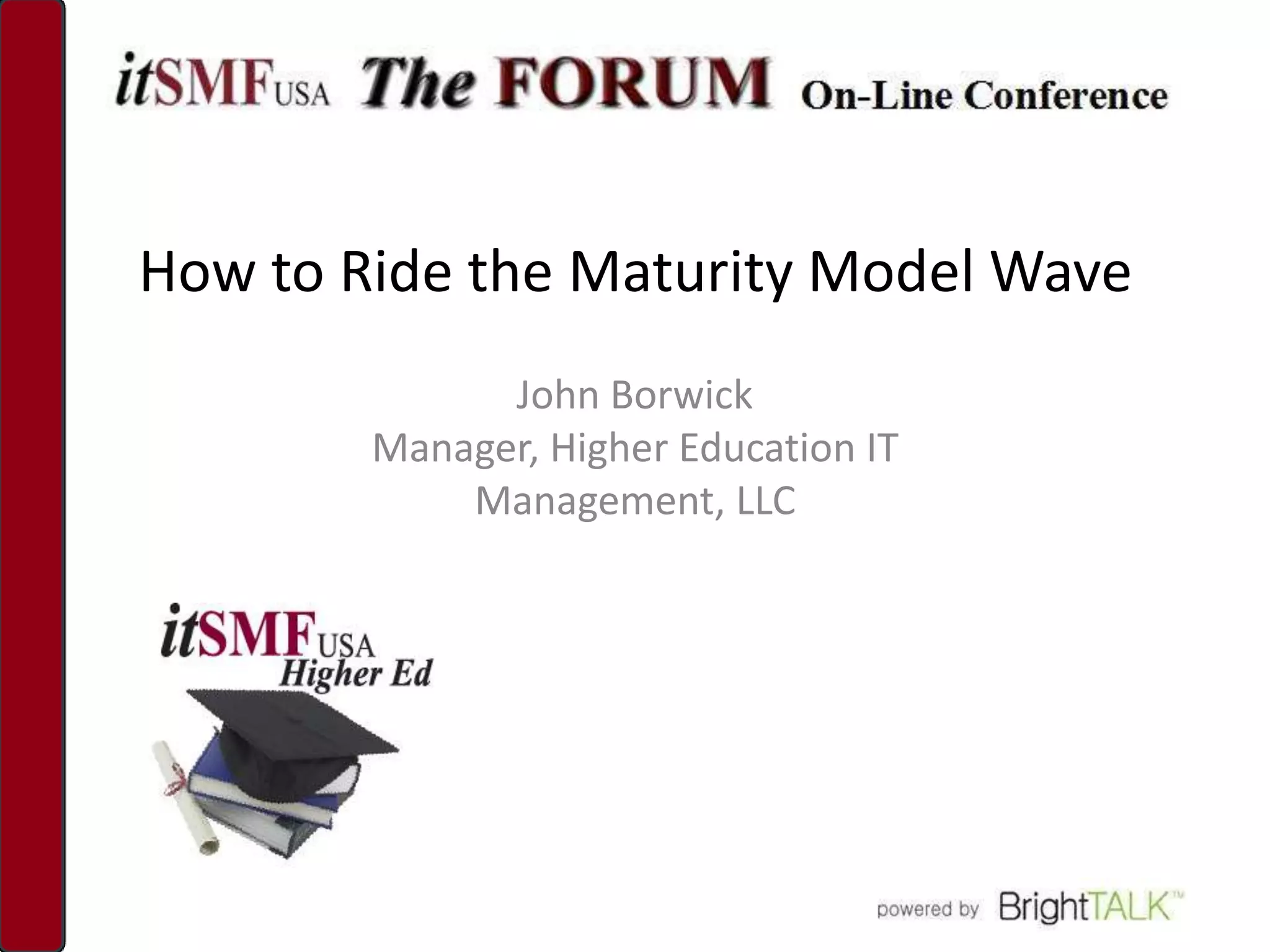 The document discusses strategies for improving IT management in higher education by utilizing maturity models and change management frameworks. It emphasizes the importance of stakeholder engagement, understanding mental models, and creating incremental improvements to foster effective IT service management. Key resources and examples are provided to guide institutions in navigating the complexities of change within academic environments.