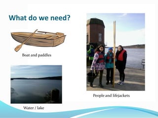 This document provides instructions for taking a group out on a boat trip, including what equipment is needed, safety considerations, and steps for getting on and off the boat and using paddles to move and steer the boat. Safety gear like lifejackets and footwear should be worn according to weight. Only one person should stand at a time and swinging, rowing in bad weather, and collisions should be avoided. Getting on and off the boat carefully and balancing the load is important, with the rower boarding last. Proper technique like depth and speed of paddles is covered for efficient movement and steering in different directions or stopping. External factors like wind, currents, depth, and boat traffic also affect speed.