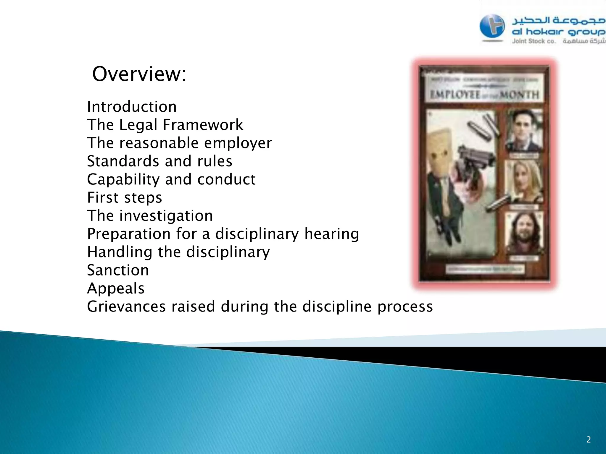 The document discusses the importance of establishing clear standards of conduct and performance for employees. It notes that standards must be specific, measurable, achievable, realistic and time-bound. It provides an example where a manager's communication of standards to an employee about attendance was unclear, leading to misunderstanding. The key points are that standards must be clearly defined and communicated to all staff to set expectations and reduce disciplinary issues. Vague expectations will lead to problems.