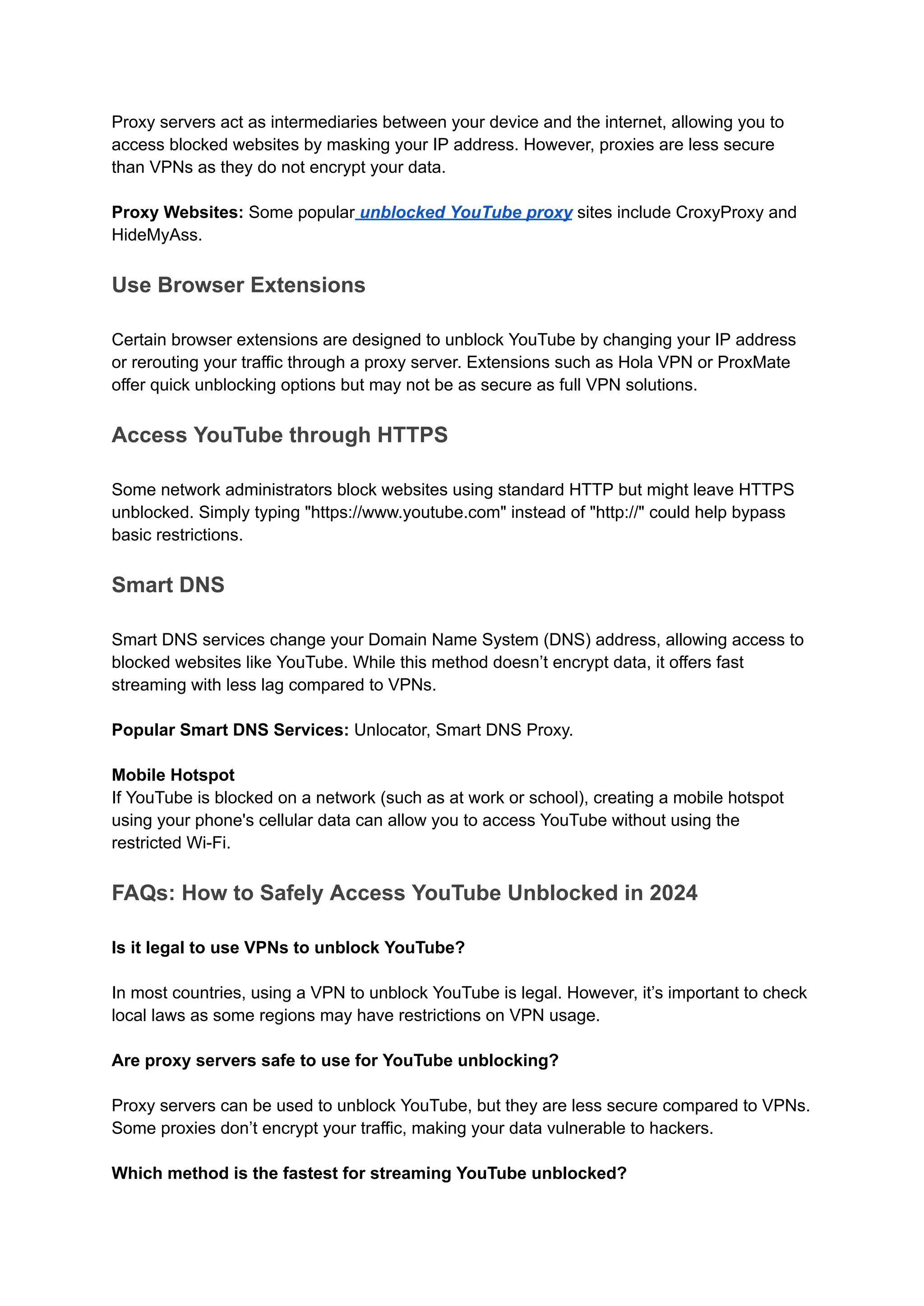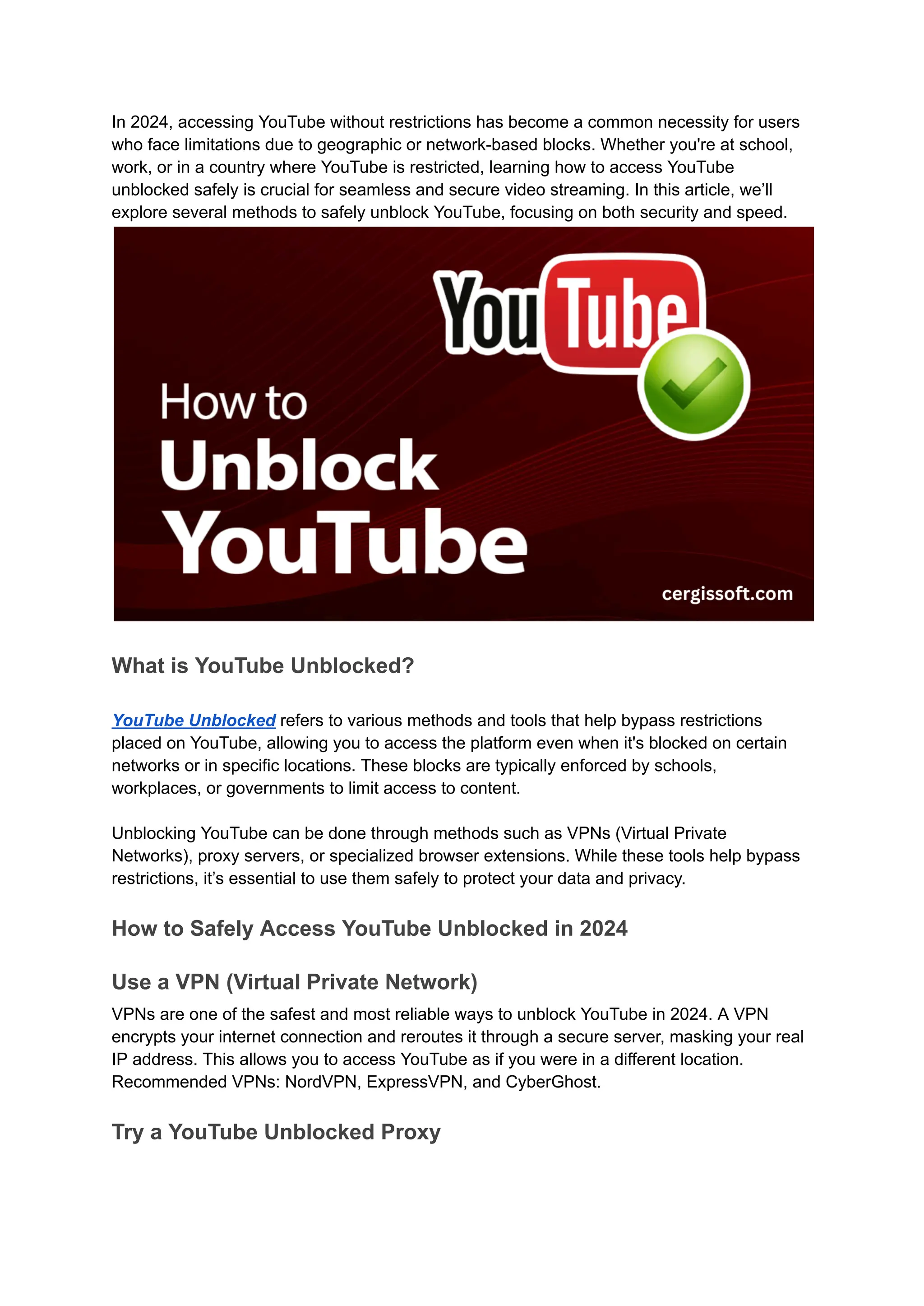 YouTube Unblocked refers to various methods and tools that help bypass restrictions placed on YouTube, allowing you to access the platform even when it's blocked on certain networks or in specific locations. These blocks are typically enforced by schools, workplaces, or governments to limit access to content.Unblocking YouTube can be done through methods such as VPNs (Virtual Private Networks), proxy servers, or specialized browser extensions. While these tools help bypass restrictions, it’s essential to use them safely to protect your data and privacy.VPNs are one of the safest and most reliable ways to unblock YouTube in 2024. A VPN encrypts your internet connection and reroutes it through a secure server, masking your real IP address. This allows you to access YouTube as if you were in a different location.Some low-quality proxies can slow down your connection, resulting in lower video quality. However, premium services like HideMyAss and 4everproxy maintain fast streaming speeds for high-definition videos.