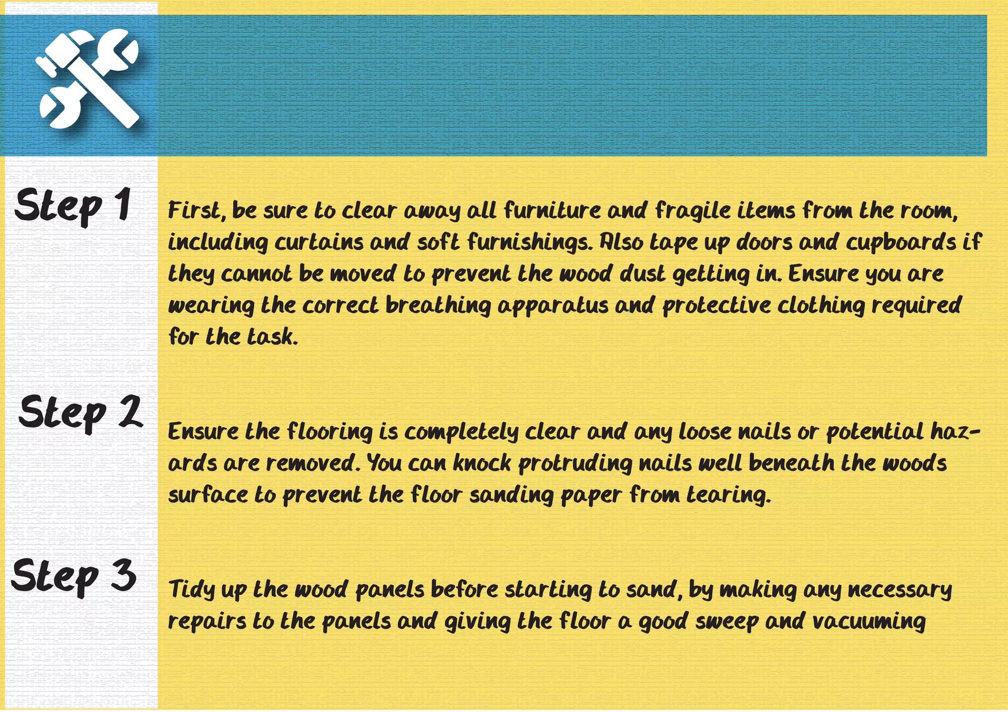 To sand a floor, clear all furniture from the room and protect doors and cupboards from wood dust. Remove any hazards from the floor and repair any wood panels before starting to sand. Load the floor sander with sandpaper and sand the floor in gradual passes from one side of the room to the other, sanding with the grain. Finish by sanding edges and corners, then apply several coats of varnish to seal and protect the floor. Allow adequate drying time between coats and before using the floor.