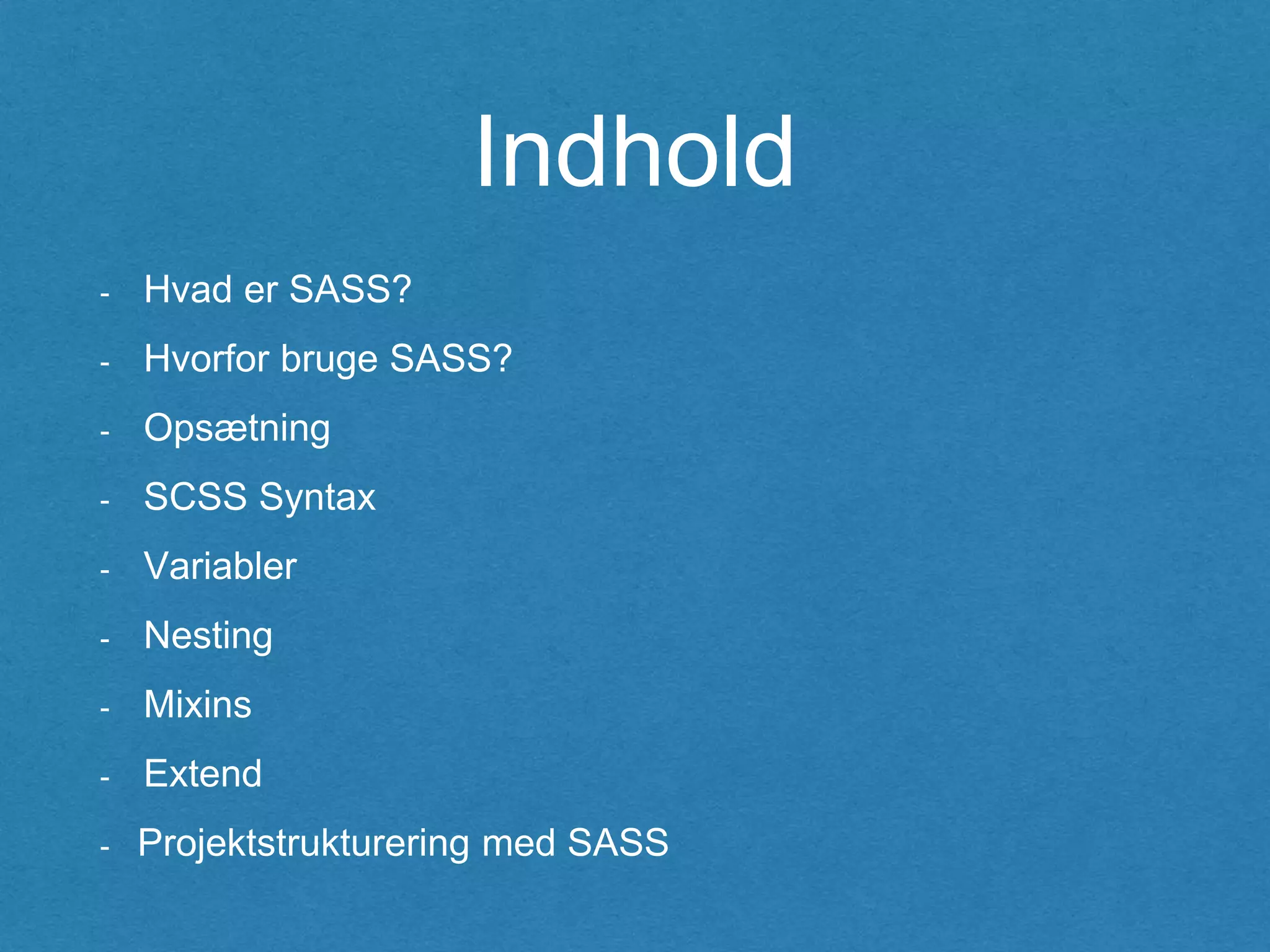As mentioned earlier, the slideshow is in danish, because there is already tons of english "How to SASS" guides, and the SASS documentation page is also well explained.