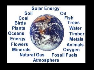 This document discusses various types of natural resources like water, minerals, food, land and energy. It explains what natural resources are and some of the threats they face like deforestation, pollution and over-exploitation due to population growth. It provides various measures that can be taken to conserve these resources like afforestation, reducing overgrazing, implementing forest acts, rainwater harvesting and reducing pollution from industries and agriculture. The document emphasizes the importance of conserving our natural resources for future generations.