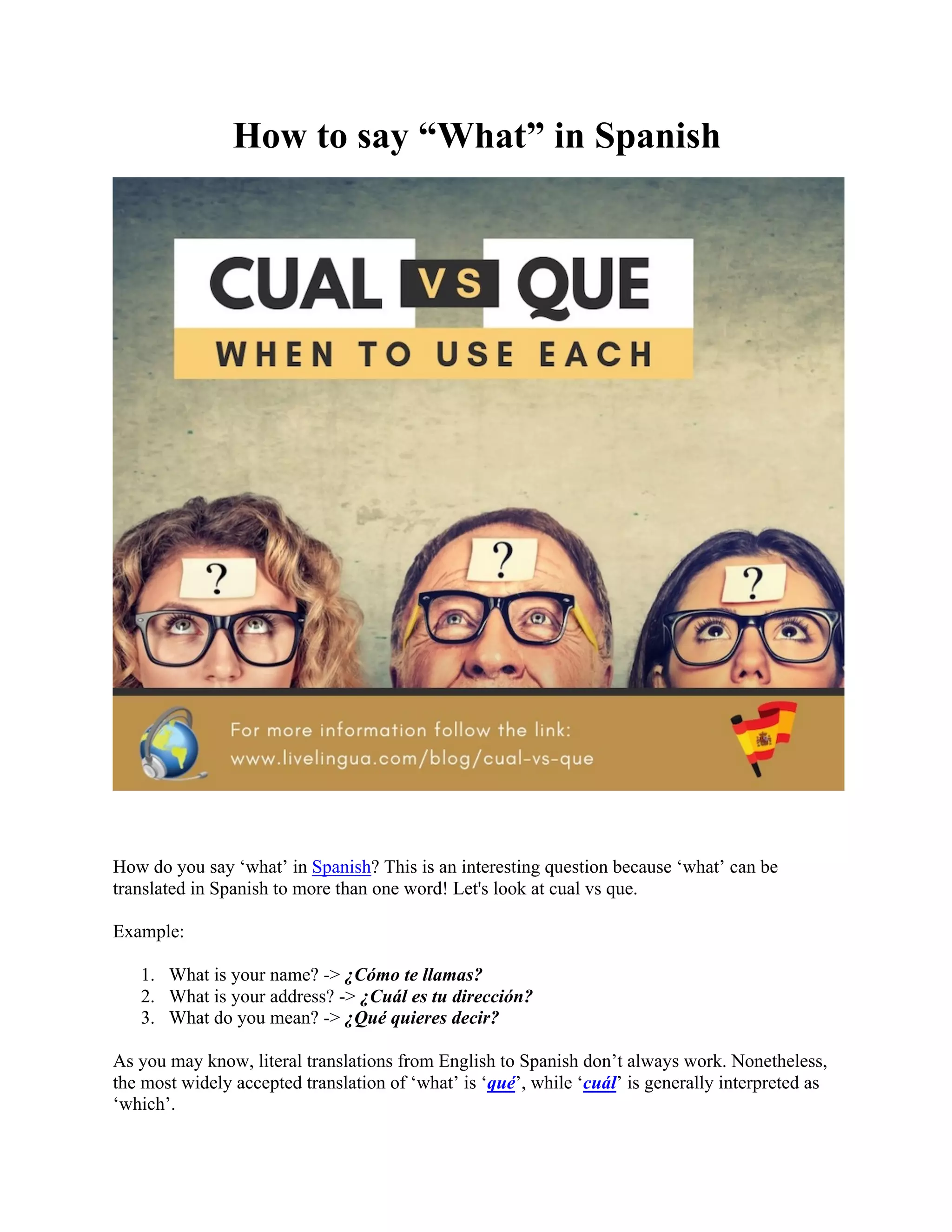 The document explains how to translate the word 'what' in Spanish, distinguishing between 'qué' and 'cuál'. It provides examples of how each word is used in different contexts, along with a list of common Spanish question words. Moreover, it emphasizes the importance of accents in interrogative terms and suggests resources for further learning.