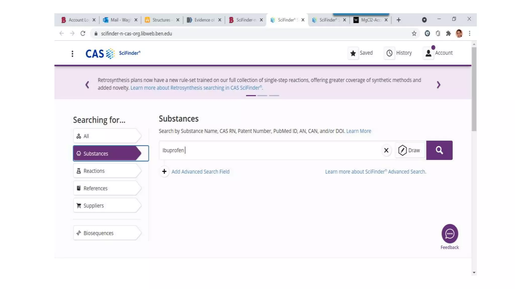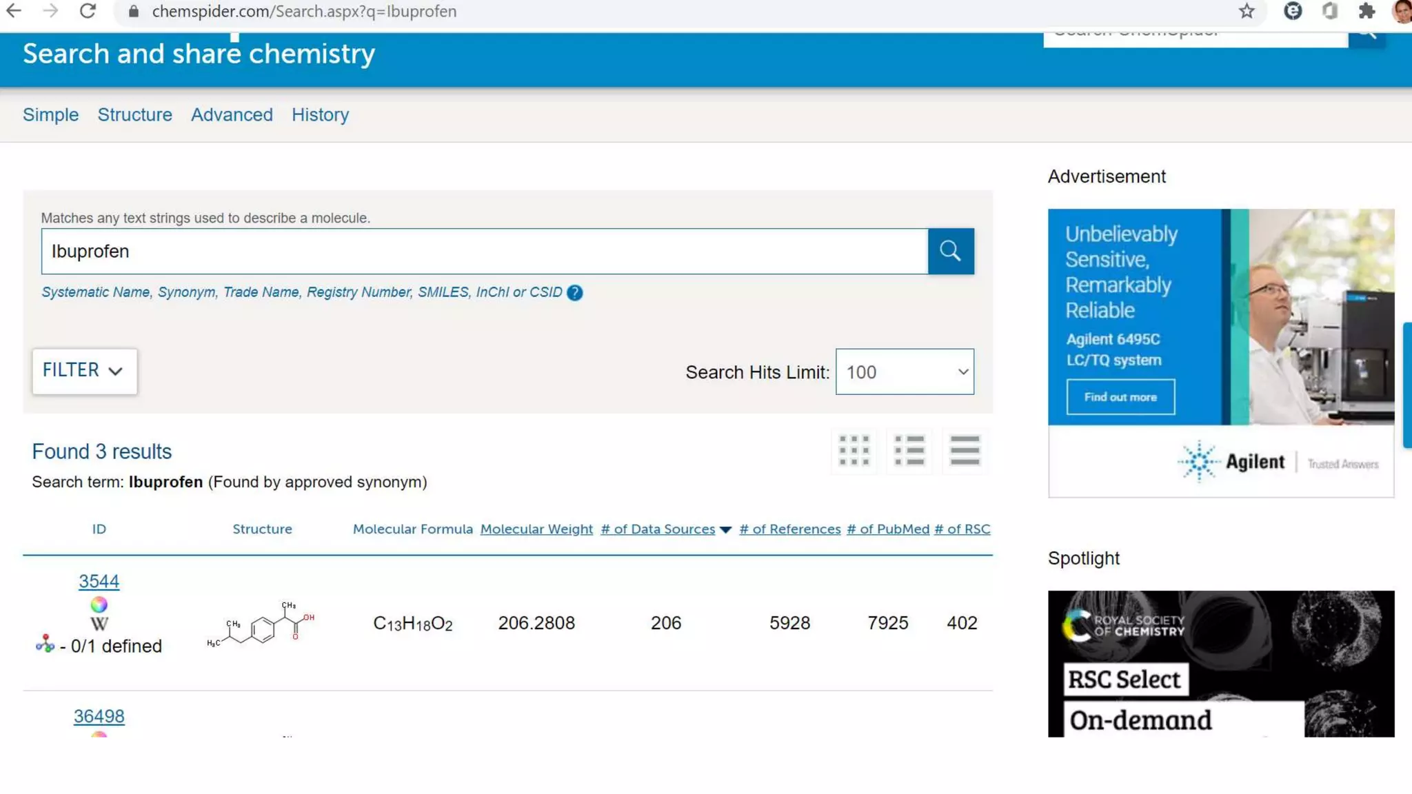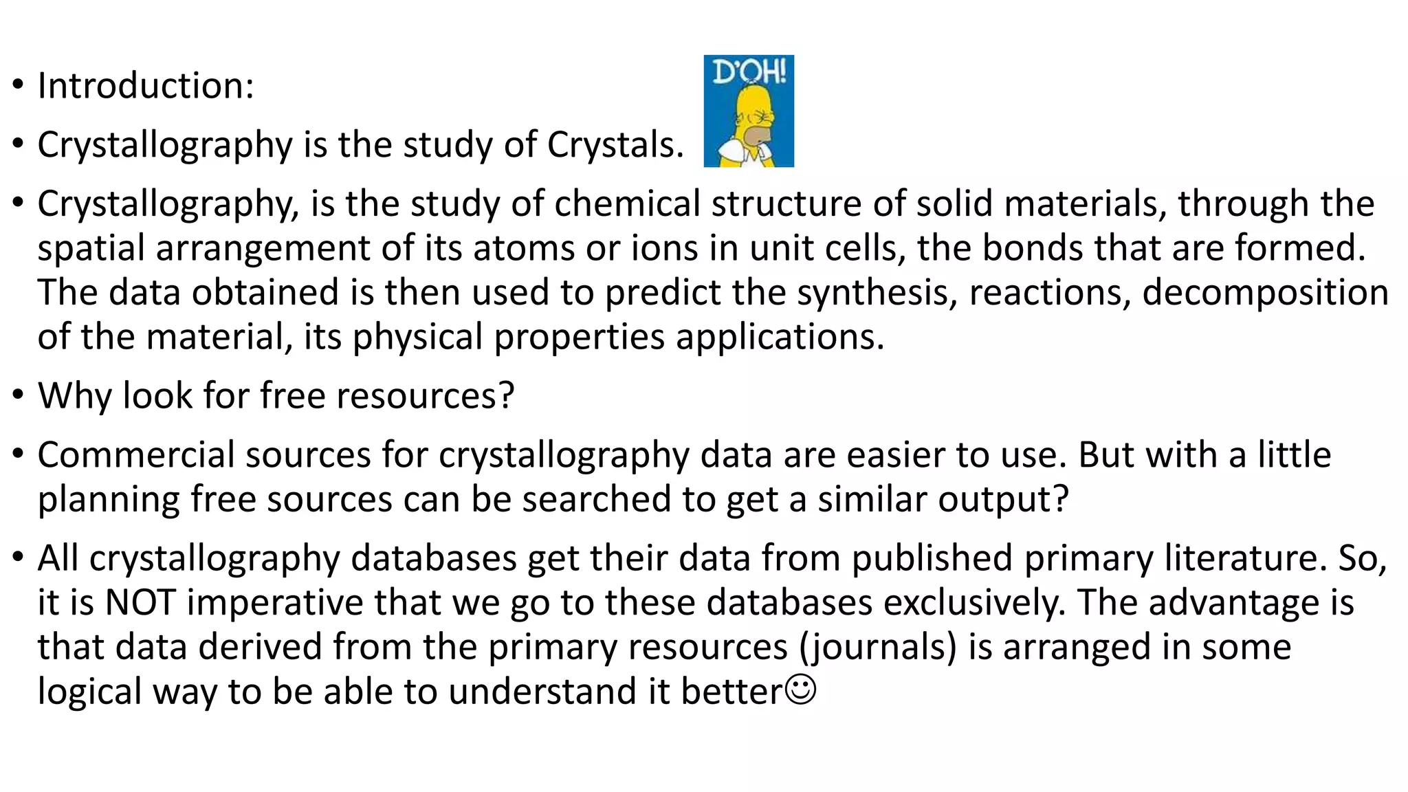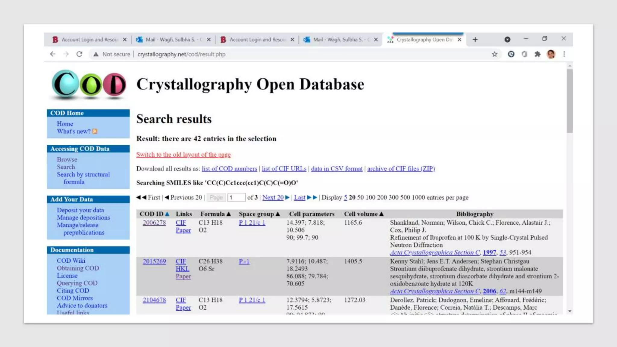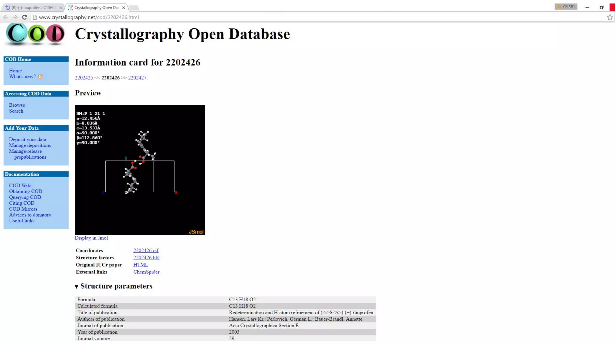 This document provides information on how to search free crystallography databases. It discusses several free databases including the Crystallography Open Database (COD), Spectral Database for Organic Compounds (SDBS), American Mineralogist Crystal Structure Database, and Bilbao Crystallographic Server. It also shows how to search the commercial SciFinder-n database through a university library subscription. Examples are provided of searching for ibuprofen data on PubChem, ChemSpider, and COD to find chemical structures, properties and spectral information. Free software like Avogadro can be used to view crystal structure files from these databases.
