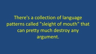 The document discusses the concept of 'sleight of mouth' language patterns that can effectively challenge limiting beliefs and suggests that human understanding is often based on flawed perceptions. It emphasizes that many beliefs are influenced by fear and the desire to protect one's ego, leading to inaccurate interpretations of reality. To overcome these limitations, the document encourages acknowledging fear and progressively dismantling it to achieve personal growth.