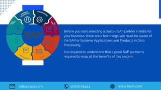 The document provides guidelines for selecting a reputable SAP partner in India, emphasizing the importance of experience in software development and project management. It suggests looking for partners with in-depth knowledge of ERP solutions for small enterprises and a quick deployment ability to meet business needs. LNSEL is presented as a leading SAP partner, offering robust ERP solutions and collaboration with major technology firms.