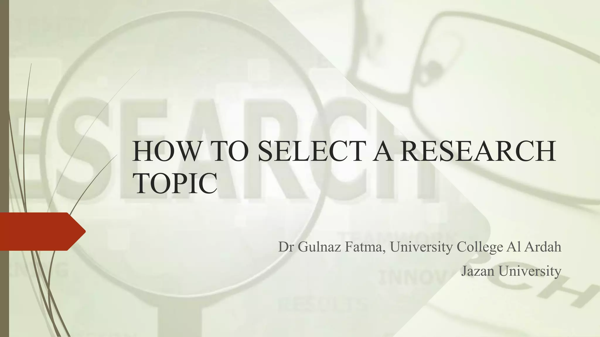 The document provides guidance on selecting a research topic, including brainstorming ideas, choosing a manageable topic, defining the topic as a focused research question, and formulating a thesis statement. Some key steps are brainstorming topics based on personal interests or current events, reading background information to identify keywords, focusing the topic by limiting its scope, and researching the topic to answer the research question. The goal is to select a topic that can be thoroughly researched within the assigned parameters.