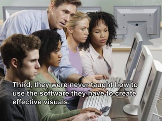 The document discusses the challenges business professionals face when creating effective presentations and offers a process to select and create visuals without needing a design background. It outlines six categories of visuals and provides tips and techniques for effectively communicating messages through various visual formats. The author, Dave Paradi, emphasizes clarity and simplicity in presentation design, sharing his expertise as a recognized presentation expert.