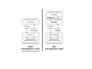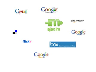This document compares AJAX and Flex technologies for building rich internet applications (RIAs). It provides examples of applications built with each technology. AJAX allows updating parts of a web page asynchronously using JavaScript, XML, and CSS. Flex is a framework for building RIAs using ActionScript code. Both have benefits for developers and enterprises. The document concludes that AJAX is better for small, frequent updates while Flex is better for large, complex applications requiring rich media. It also provides an example of how AJAX and Flex can be used together interoperably in a single application.