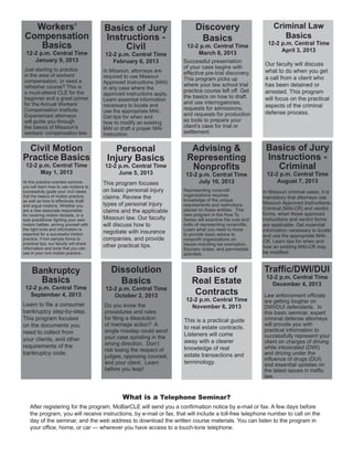 This document provides information about the Missouri Bar's "How To Series 2013" which consists of 12 interactive telephone seminars on various legal topics. Each seminar is 2.4 hours and qualifies for 2.4 hours of MCLE credit. The seminars cover topics such as workers' compensation basics, discovery basics, criminal law basics, and more. Discounted package rates are available for registering for multiple seminars. The document provides details on registration fees and how to register for individual seminars or packages. It also provides brief descriptions of the topics covered in each seminar.