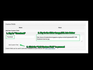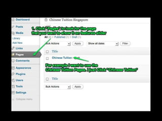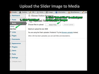 The document provides instructions for setting up a feature slider on a website by uploading slider images to the media library and then configuring the slider settings.