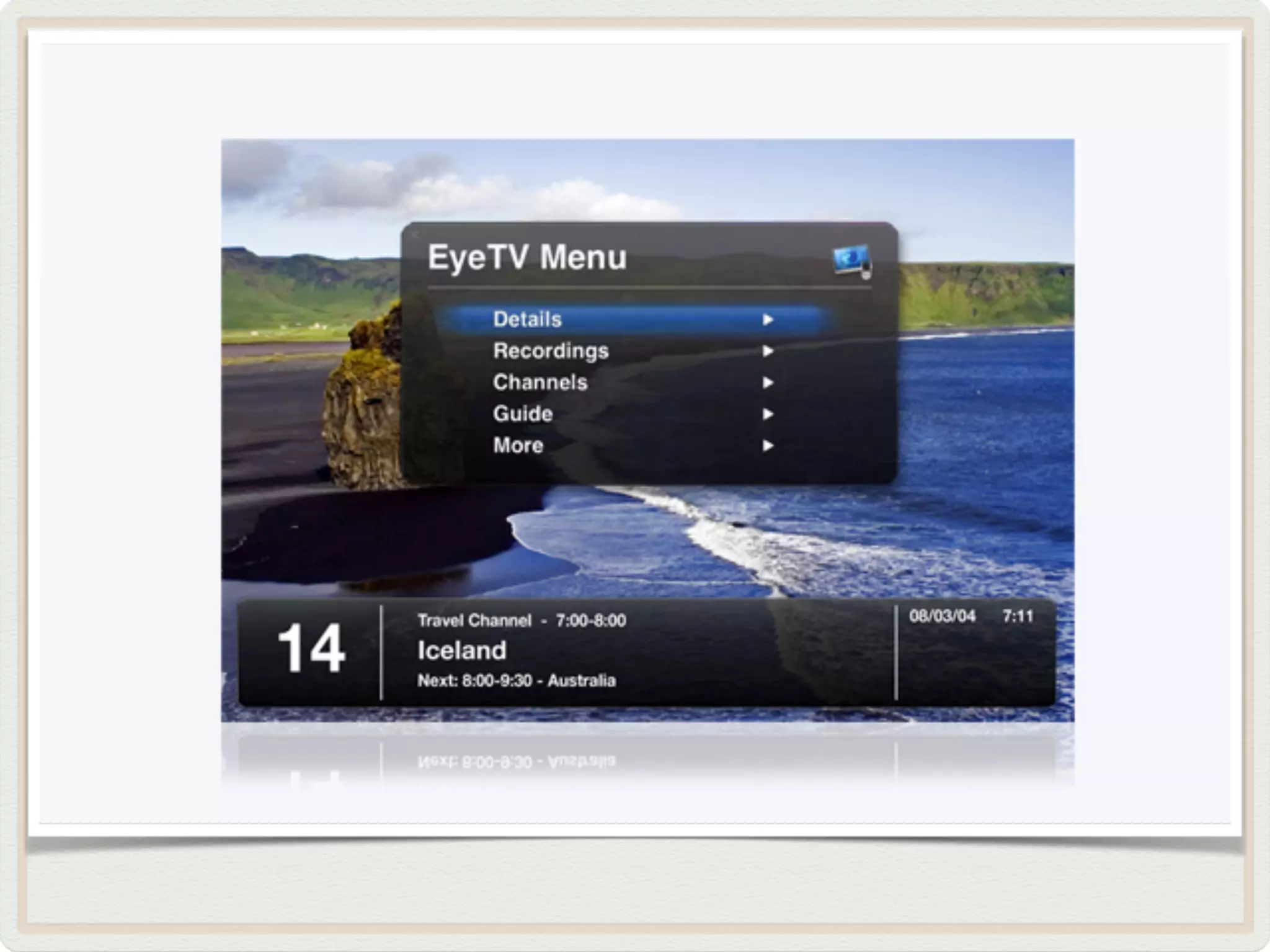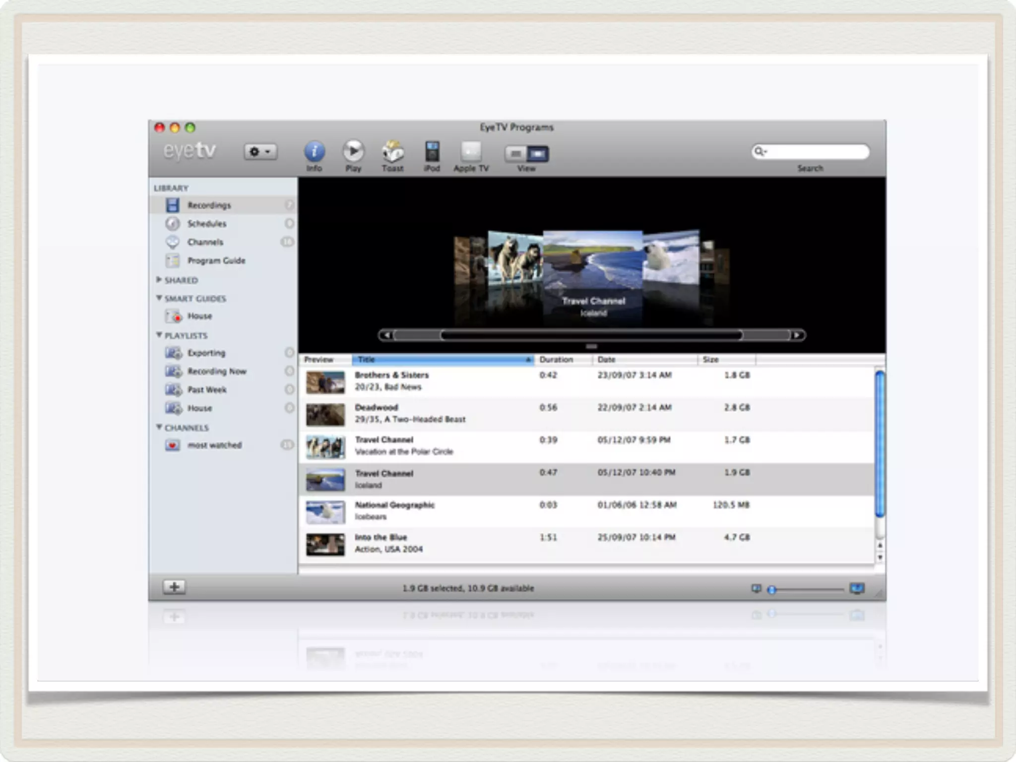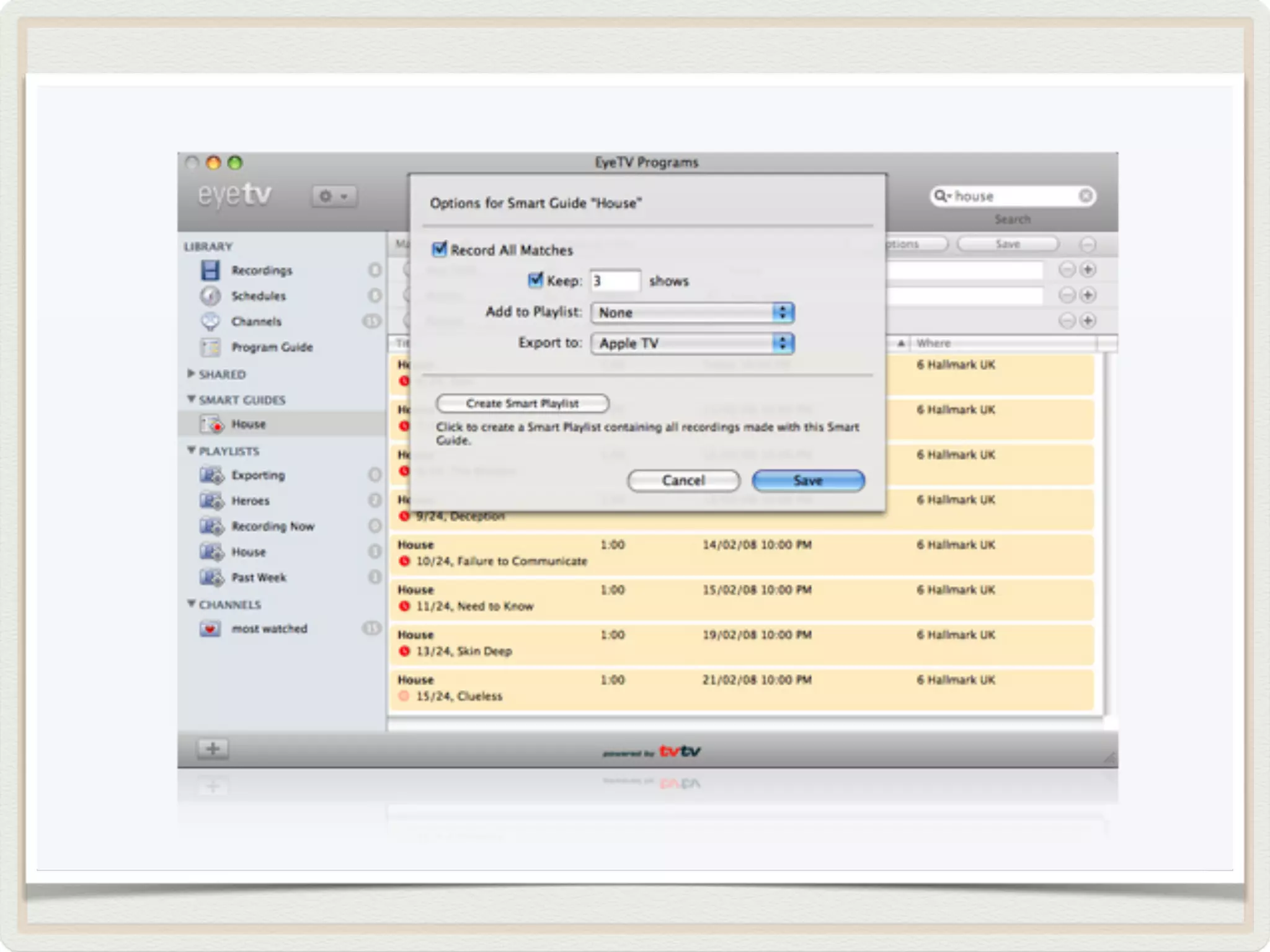 This document discusses how to set up a digital video recorder (DVR) using a computer. It explains that a DVR allows you to record live TV and watch shows on your schedule by connecting a TV tuner to your computer along with either a cable connection or antenna. It recommends using EyeTV software on a Mac computer as it integrates with other Apple devices like iPhone, iPad and Apple TV. The document provides an example setup with a Mac Mini server running EyeTV to record shows and an Apple TV to view recordings throughout the home.