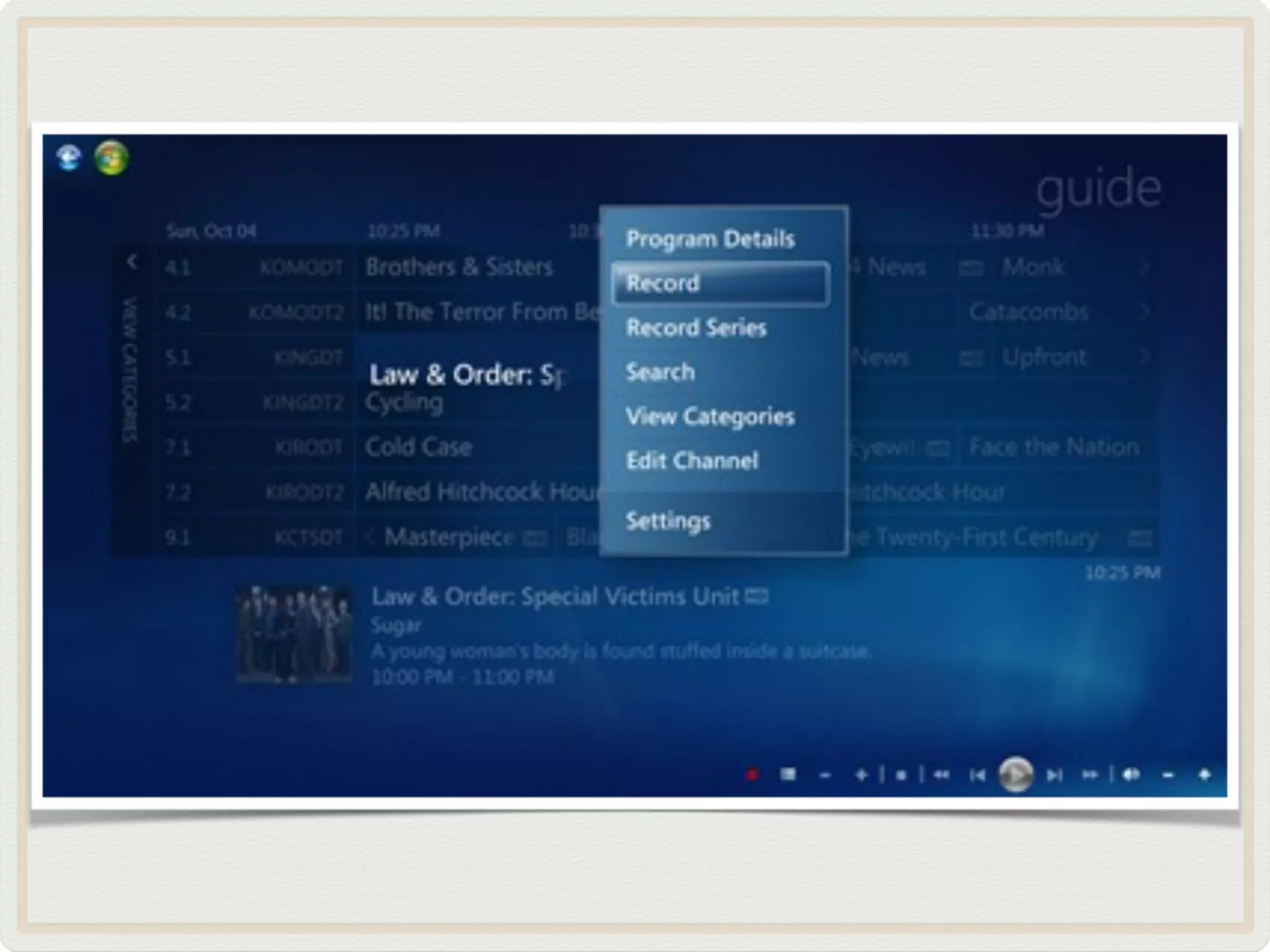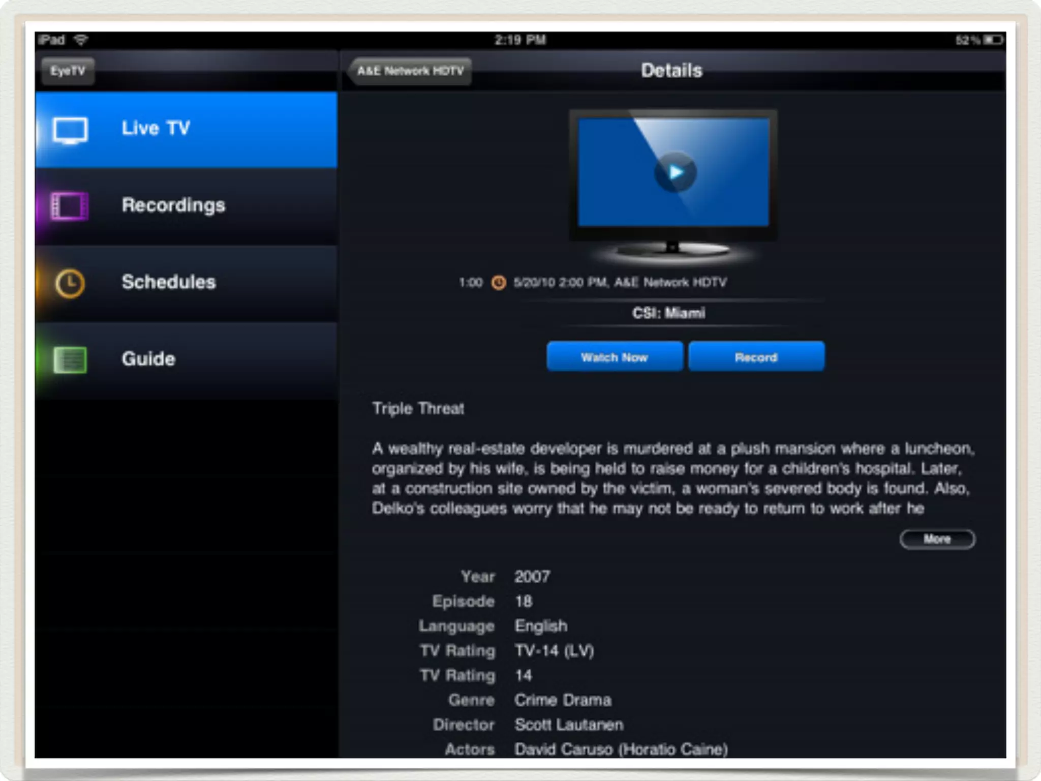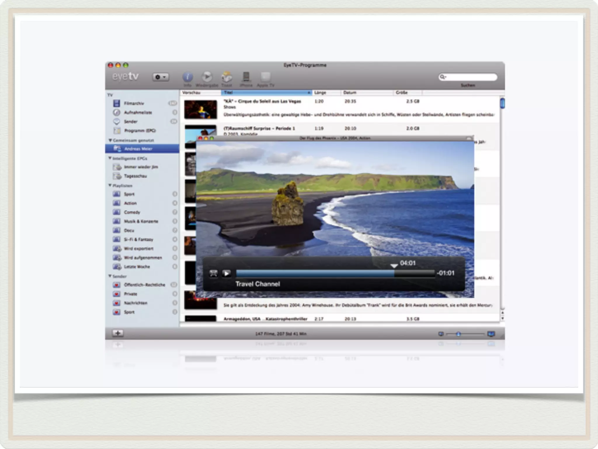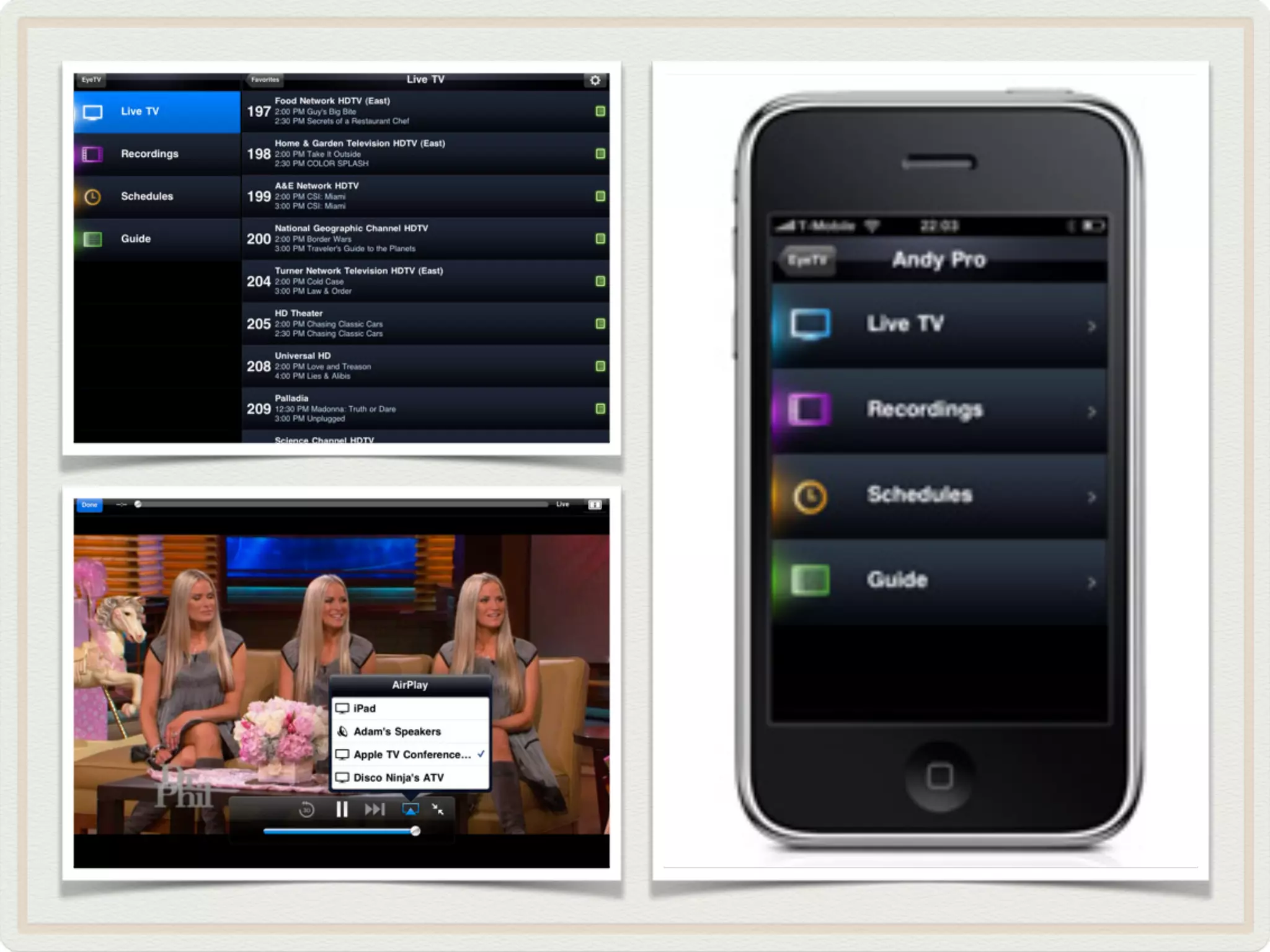 This document discusses how to set up a digital video recorder (DVR) using a computer. It explains that a DVR allows you to record live TV and watch shows on your schedule by connecting a TV tuner to your computer along with either a cable connection or antenna. It recommends using EyeTV software on a Mac computer as it integrates with other Apple devices like iPhone, iPad and Apple TV. The document provides an example setup with a Mac Mini server running EyeTV to record shows and an Apple TV to view recordings throughout the home.
