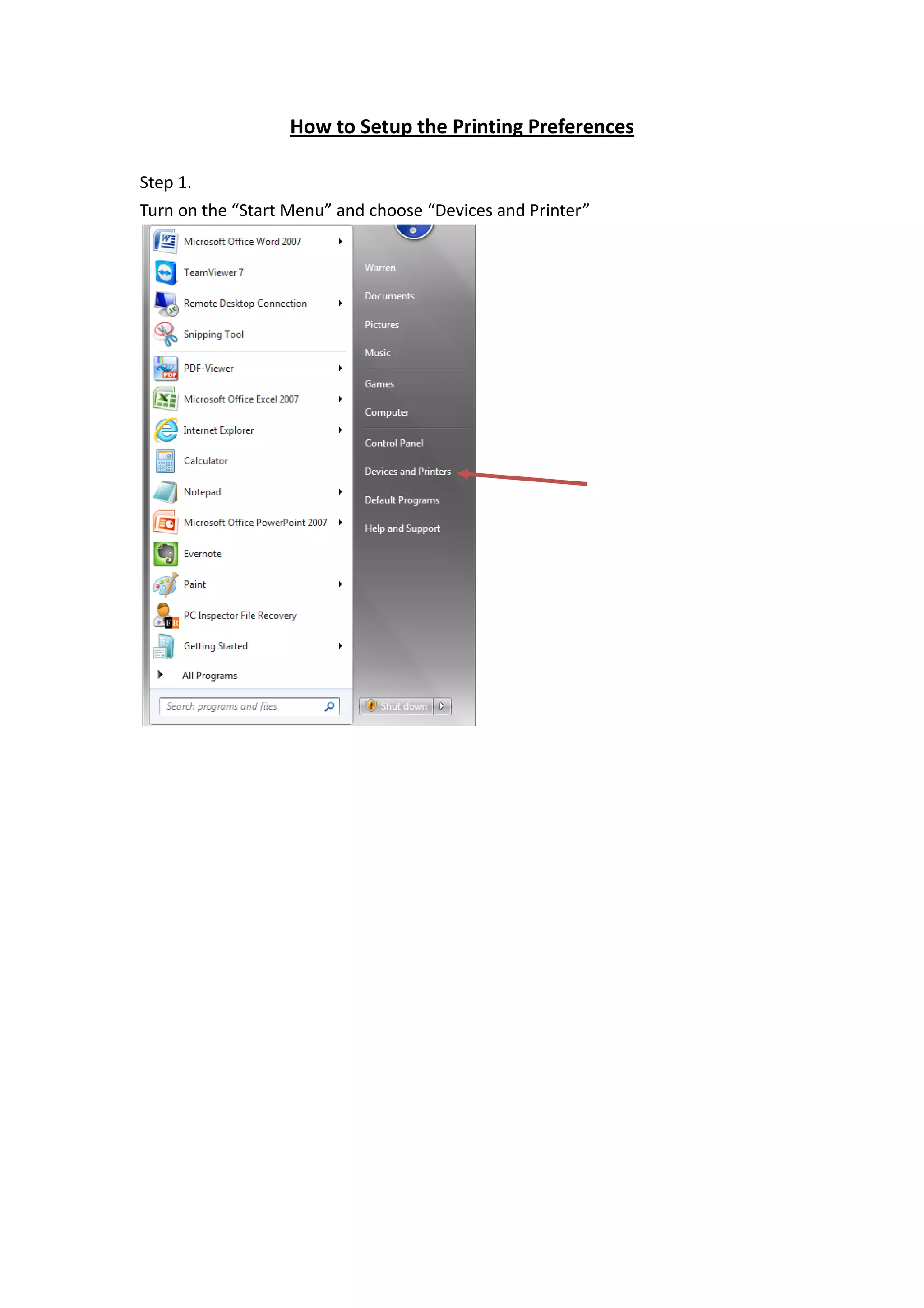 To set up printing preferences, open the Start Menu and Devices and Printers, select the desired printer, right click it and choose Printing Preferences to configure settings, then you can enjoy using the printer with your customized preferences.