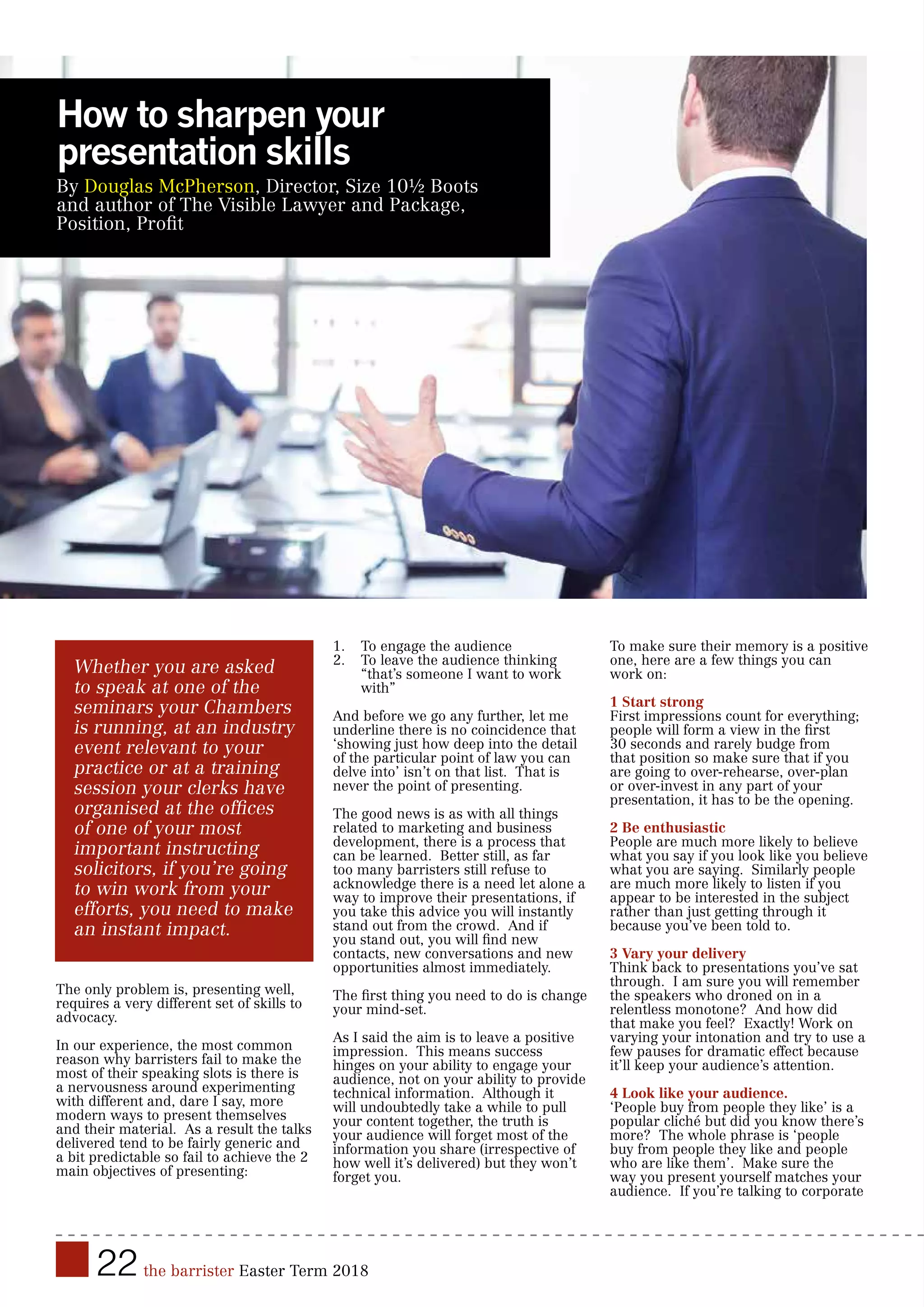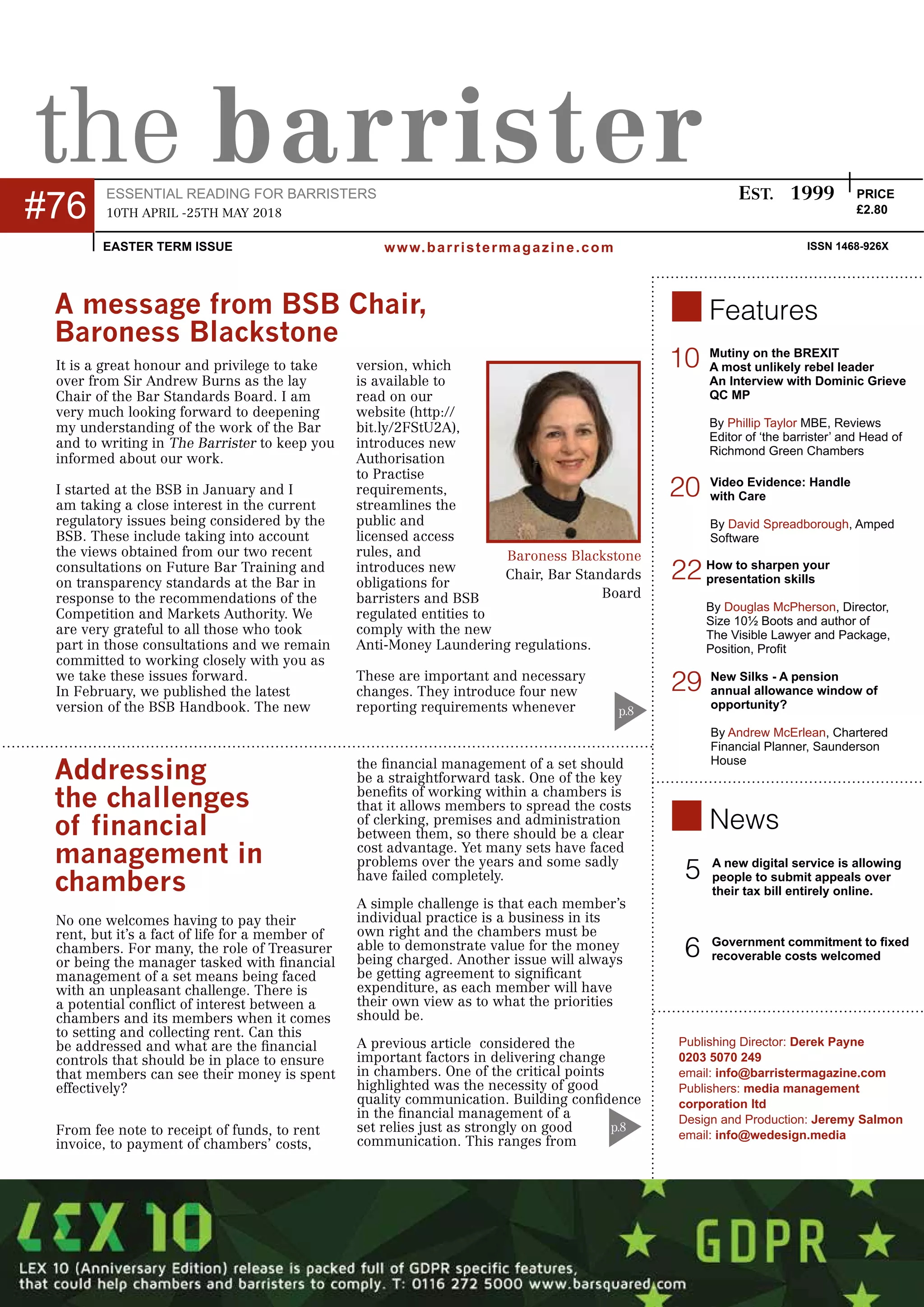 The document is an issue of "The Barrister" magazine dated Easter Term 2018. It contains the following articles: