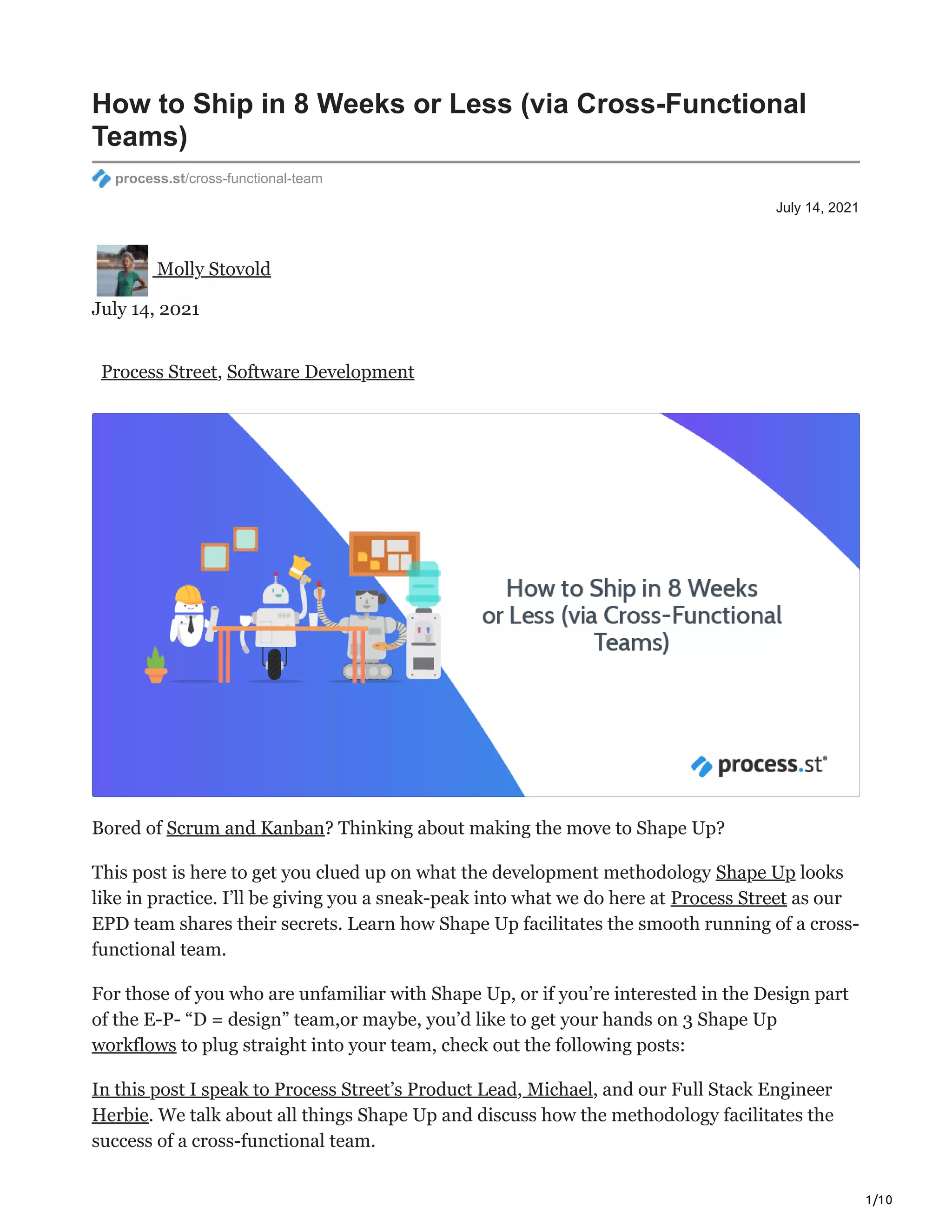 The document discusses the 'Shape Up' development methodology used by Process Street, highlighting its benefits over traditional methods like Scrum and Kanban. It emphasizes increased focus on strategy, reduced overhead from meetings, and greater ownership for teams, allowing them to work in longer cycles without the burden of an extensive backlog. Key insights from team members outline how Shape Up empowers them to respond quickly to market demands with a streamlined process that improves productivity and team morale.