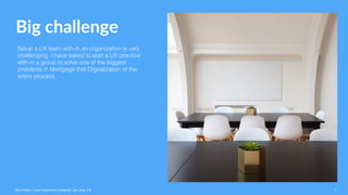 Ravi Palwe was asked to start a UX practice within a group to help simplify the mortgage process through digitalization. He began by collaborating with existing teams, conducting stakeholder interviews, and using sticky notes to brainstorm ideas. Through user research including creating user profiles and industry research, Ravi sought to understand users better since the existing system was developed without user insights. He then set up workshops to collaboratively design solutions with developers and subject matter experts. Ravi worked on scenarios, storyboards, and prototypes using tools like Sketch and Marvel to match user goals with business requirements.