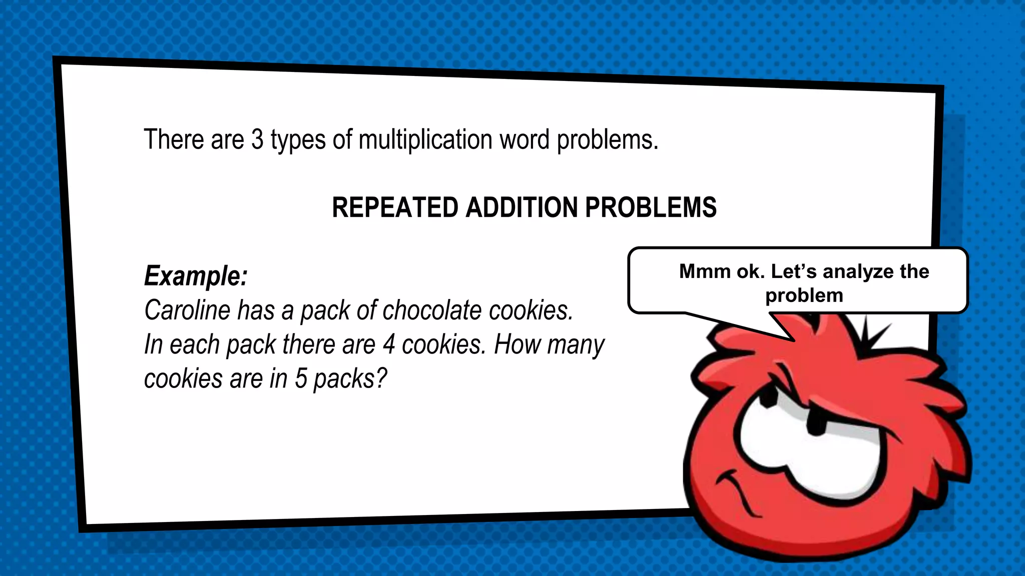 There are three types of multiplication word problems: repeated addition problems, rectangular arrangement problems, and proportion problems. Repeated addition problems involve finding the total by adding multiple sets of the same quantity. Rectangular arrangement problems involve finding the number of combinations between two sets by multiplying the number of elements in each set. Proportion problems involve finding the total for one set that is a specific multiple of another set.