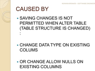 Saving changes is not permitted when altering the structure of a SQL Server 2008 table, such as changing a column's data type. This occurs because SQL Server prevents changes that require recreating the table by default. To resolve this, one can uncheck the "Prevent saving changes that require table re-creation" option in the Tools > Options > Designers menu. The document then demonstrates altering the MST_STUDENT table column data type as an example.