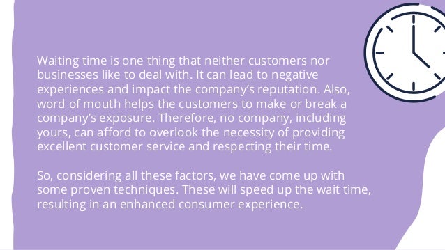 The document discusses strategies to reduce customer wait times, emphasizing the importance of customer service for maintaining a positive company reputation. Proven techniques include investing in queue management systems, using digital signage for updates, integrating self-service kiosks, optimizing customer support, and providing entertainment during waits. Implementing these strategies can enhance the consumer experience and ensure efficiency in service delivery.