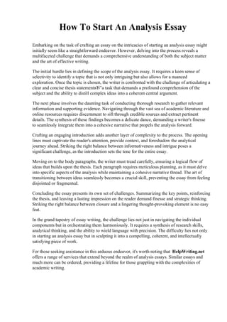 This document provides guidance on how to start an analysis essay. It outlines the key challenges involved, including defining a focused topic, developing a clear thesis statement, conducting thorough research, crafting an engaging introduction, writing coherent body paragraphs that build on the thesis, and concluding the essay effectively. Mastering these individual components and orchestrating them cohesively requires research skills, analytical thinking, and precise writing abilities. The process of starting an analysis essay is a multifaceted challenge that demands comprehensive understanding.