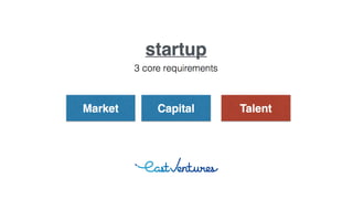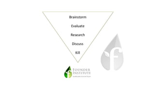 A startup is an early-stage technology company designed for rapid growth. The document discusses developing a great idea for a startup by brainstorming many ideas, evaluating them by researching market needs and learning from experts, discussing ideas with others, and selecting the best idea for the team to commit to building. Execution is more important than any single idea, so the focus is on building a team united behind a shared vision.