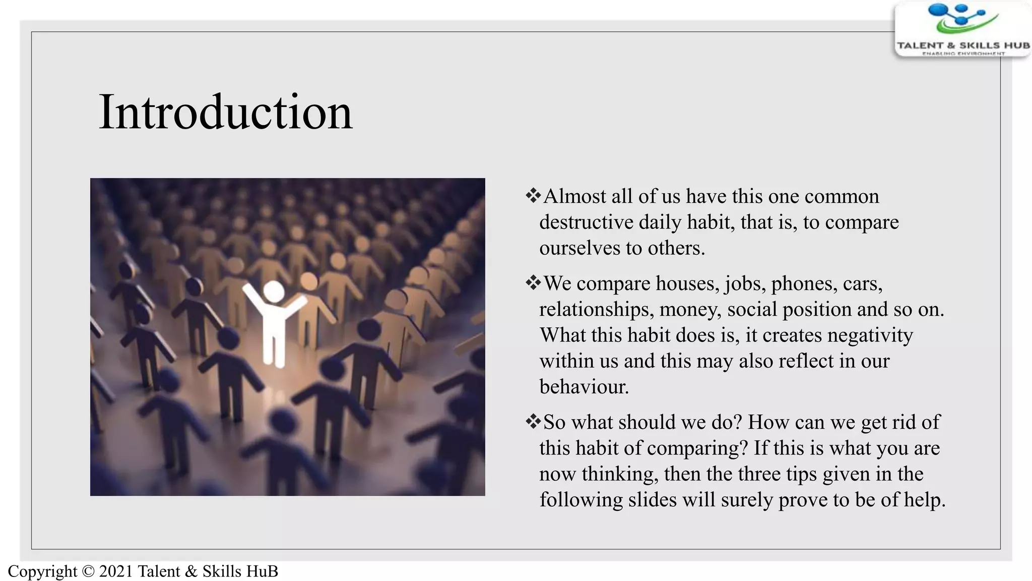 The document discusses the negative habit of comparing oneself to others, highlighting that this behavior fosters negativity and dissatisfaction. It provides three key tips for overcoming this habit: comparing oneself only to one's past self, understanding the futility of comparison, and fostering kindness towards others, which in turn improves self-perception. Ultimately, the document aims to encourage personal growth and a more positive mindset.