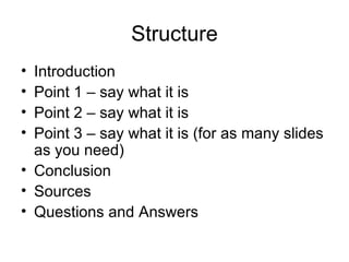 This document provides an outline for a presentation, including sections for an introduction, multiple points with supporting details, a conclusion, sources, and time for questions and answers. The introduction should overview the topic. Each point should bullet list thoughts and consider adding photos. The conclusion should bullet list 3-4 conclusions. Sources should widely cite relevant websites, materials, and notes. The presentation should end by thanking the audience and inviting questions.