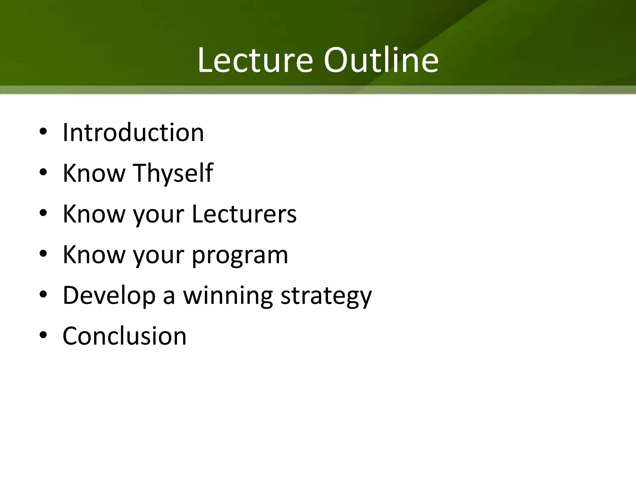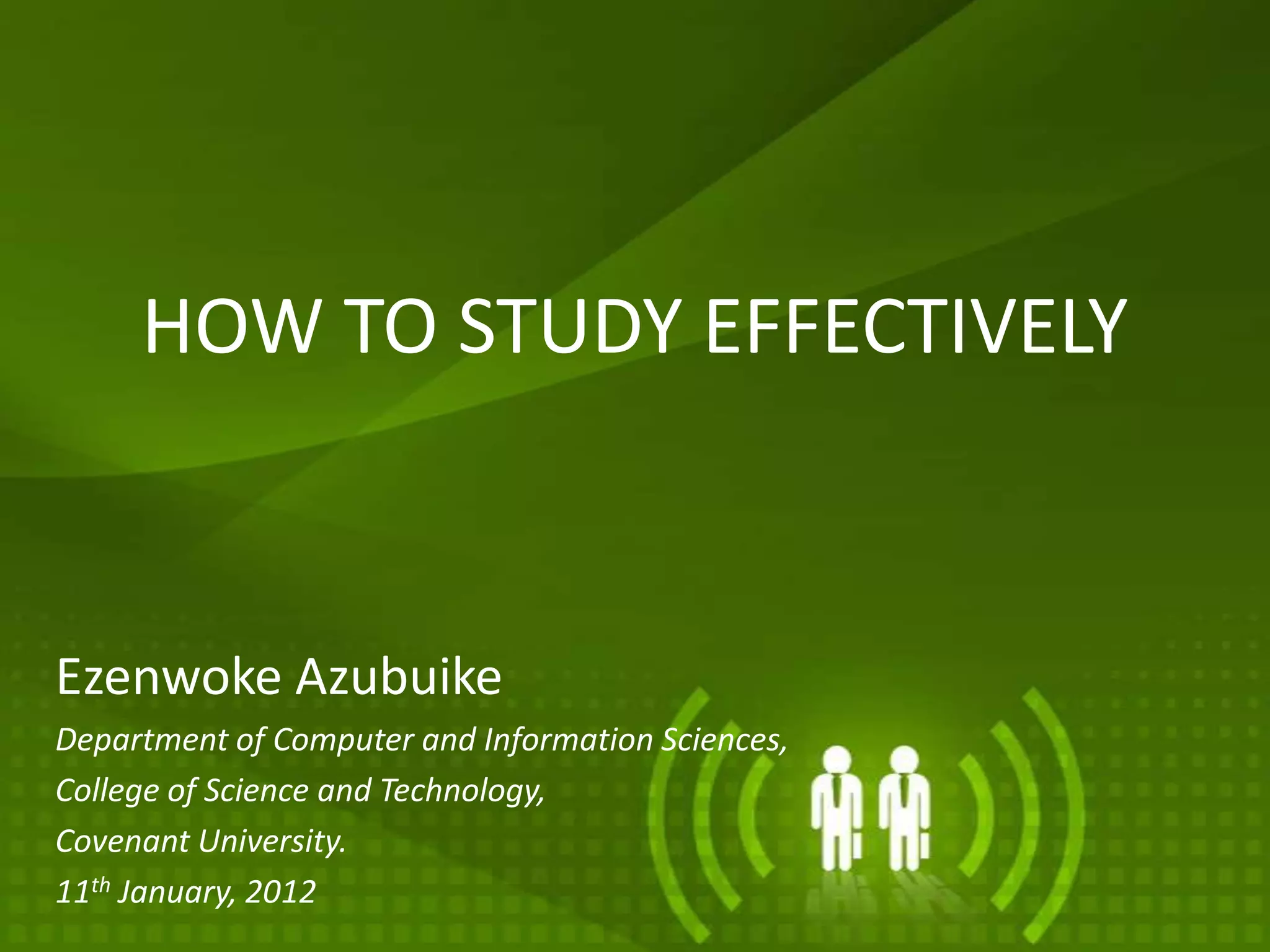 The document provides tips for studying effectively. It recommends getting to know yourself as a learner, your lecturers, and your program of study. Developing an organized strategy is key, including organizing materials, establishing a regular study schedule, forming a success council, and teaching others. Mastering these techniques can help ensure academic success.
