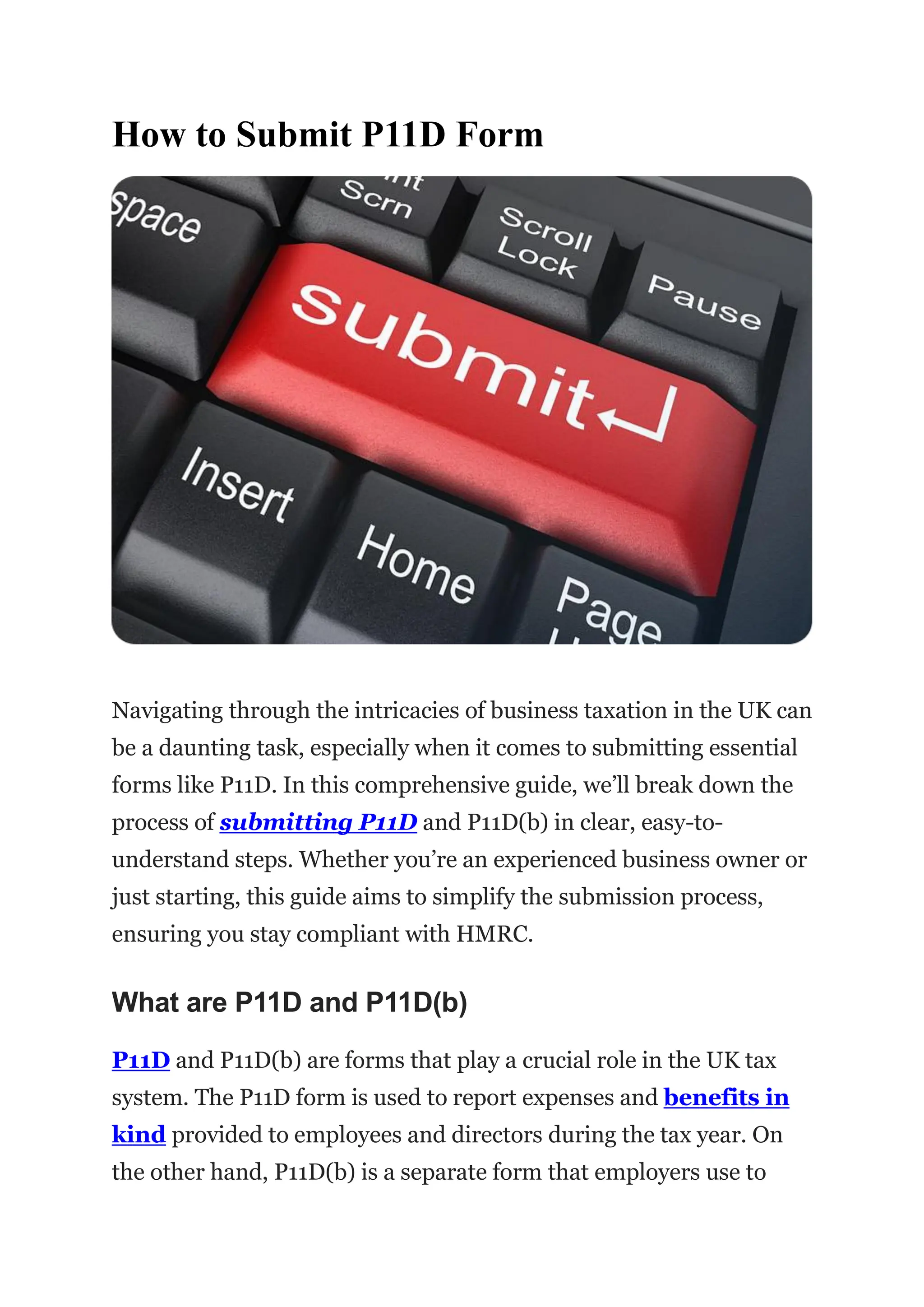 This guide details the process of submitting P11D and P11D(b) forms in the UK, which report employee benefits and associated national insurance due. It outlines submission methods using the PAYE online service or commercial payroll software, emphasizing the importance of timely submissions by the July 6th deadline to avoid penalties. The document encourages hiring professional accountants for assistance with tax compliance and reporting accuracy.
