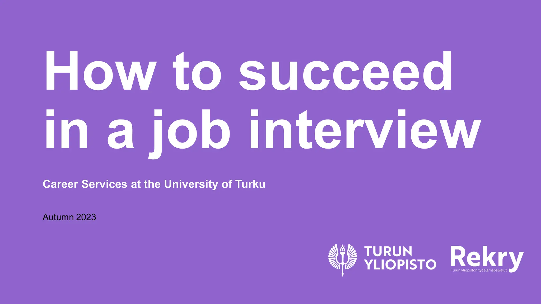 This document provides information and tips for succeeding in a job interview. It discusses how job interviews are generally relaxed conversations in Finland where the employer wants to get to know the applicant. The employer will look at the applicant's skills, experience, personality, and fit for the role and company culture. The document advises preparing for interviews by researching the company and role, considering common interview questions, and practicing responses with examples. During the interview, applicants are advised to be on time, make a good first impression, ask their own questions, and follow up after the interview.