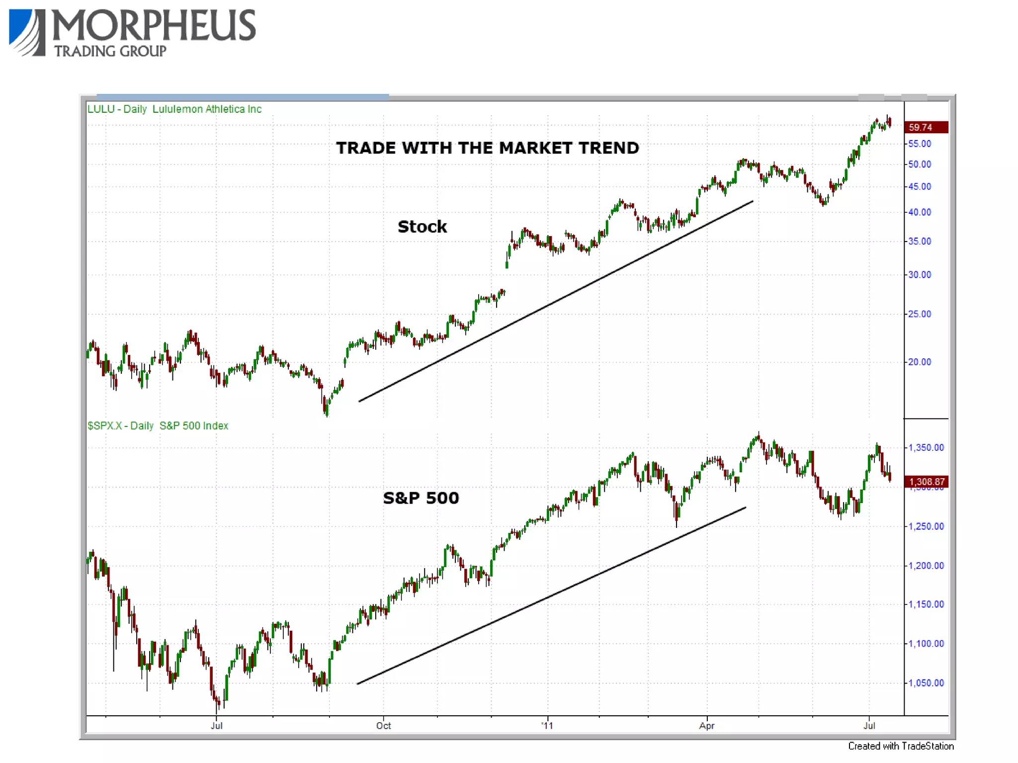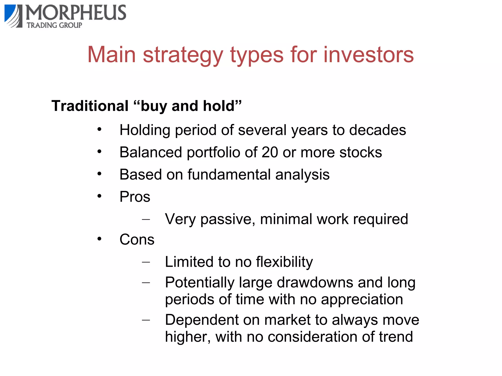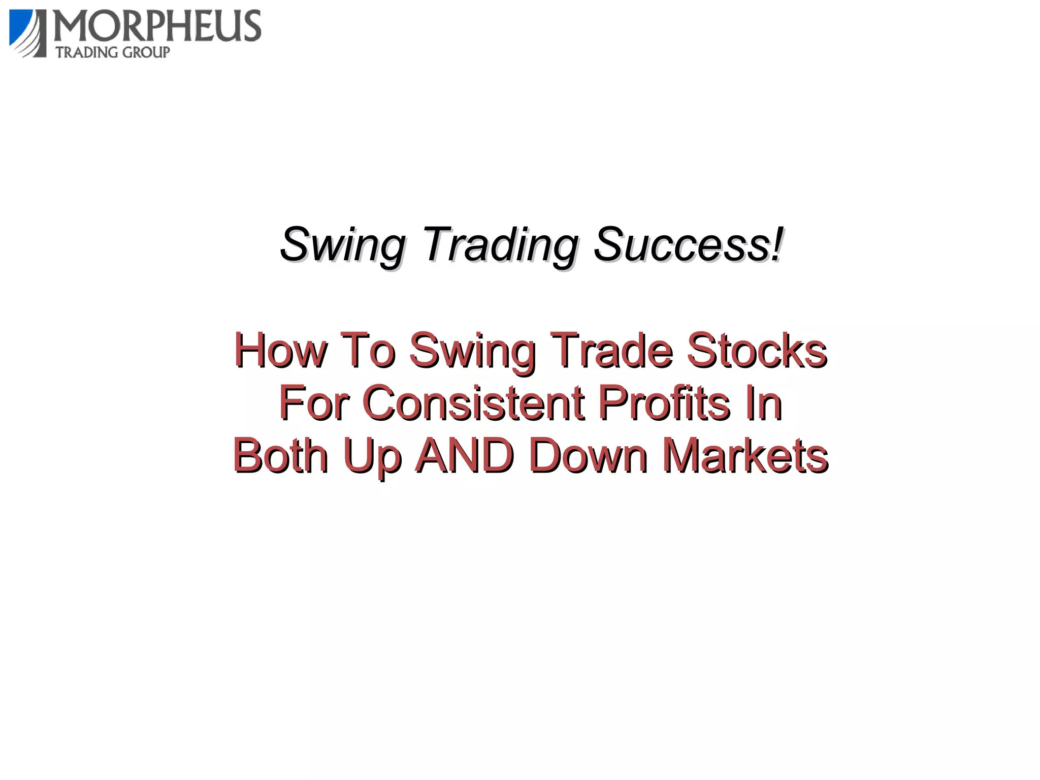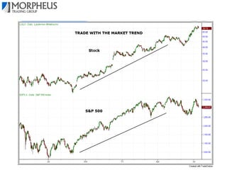 This document outlines different trading strategies and provides an overview of a swing trading strategy called Morpheus Trading (MTG) that aims to take advantage of momentum in the markets. The MTG strategy involves identifying the intermediate-term trend using daily and weekly charts, looking for proper trade setups with a breakout and pullback pattern, having a clear exit strategy, disciplined risk management by limiting losses to 1-2% per trade, and understanding how emotions like greed, fear and hope influence market movements. The strategy aims to "buy high and sell higher" by purchasing stocks trading near 52-week highs rather than bargain hunting for cheap stocks.