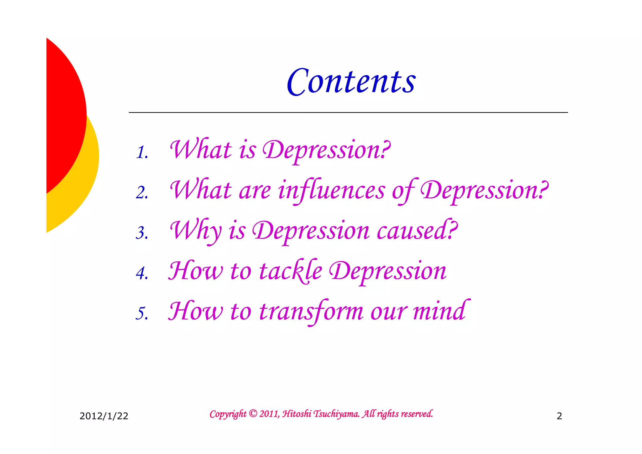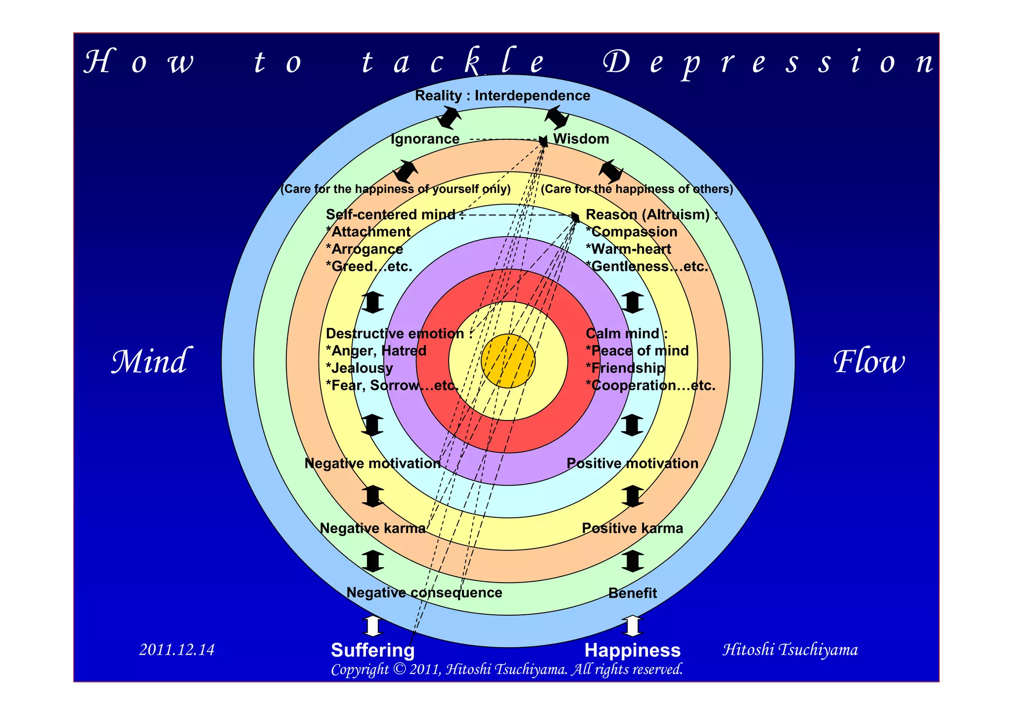 The document discusses how to tackle depression. It explains that depression is caused by a self-centered mind and lack of understanding of interdependence. It recommends reducing self-centeredness, controlling destructive emotions, and increasing altruism and compassion. Practicing compassion through actions, speech, and mind transformation can help move from suffering to happiness.