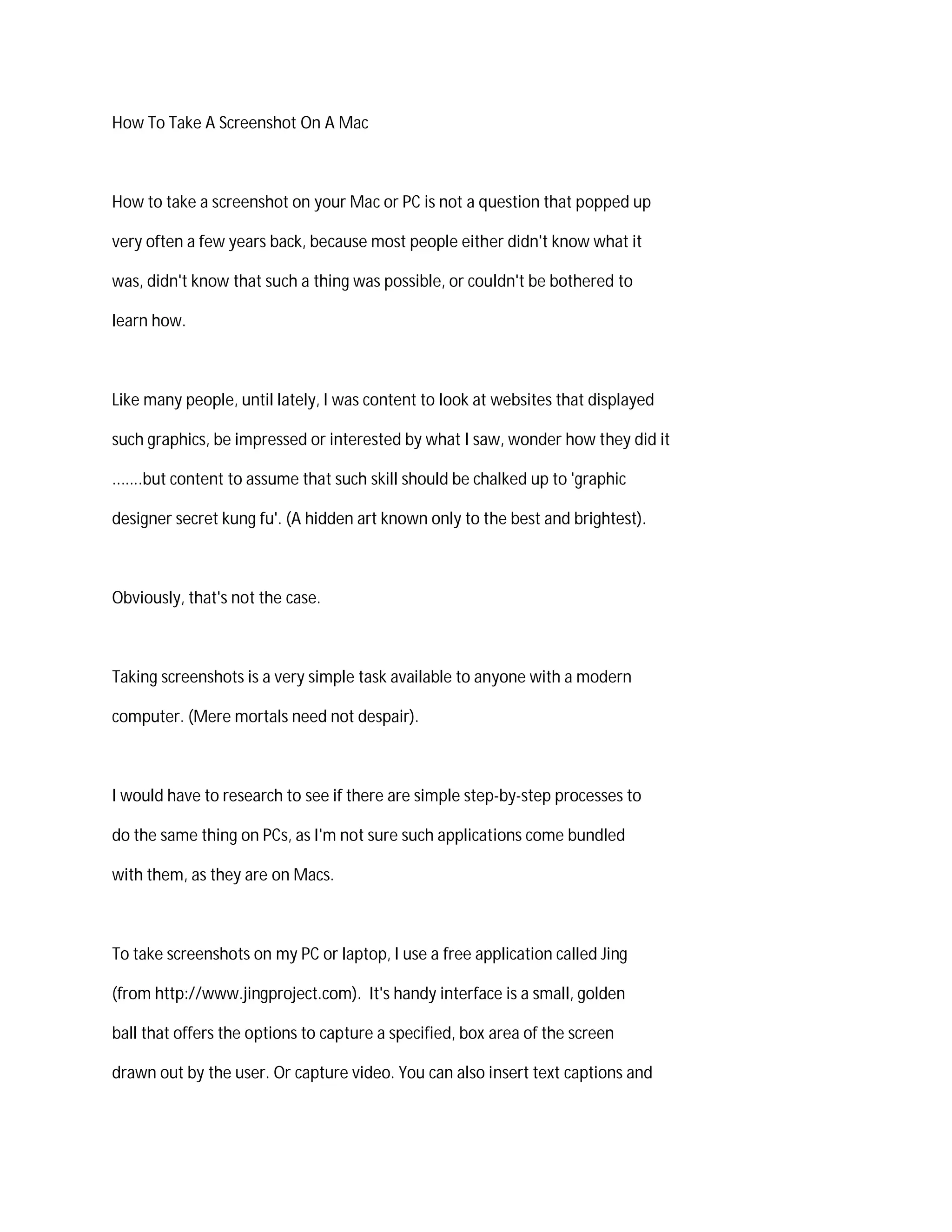 The document provides a guide on how to take screenshots on a Mac, detailing key commands for capturing the entire screen or a selected area. For a full screenshot, users press 'command', 'shift', and '3', while for a selected area, they press 'command', 'shift', and '4'. It also briefly mentions video screen recording using QuickTime and suggests further resources for more information on screenshots.