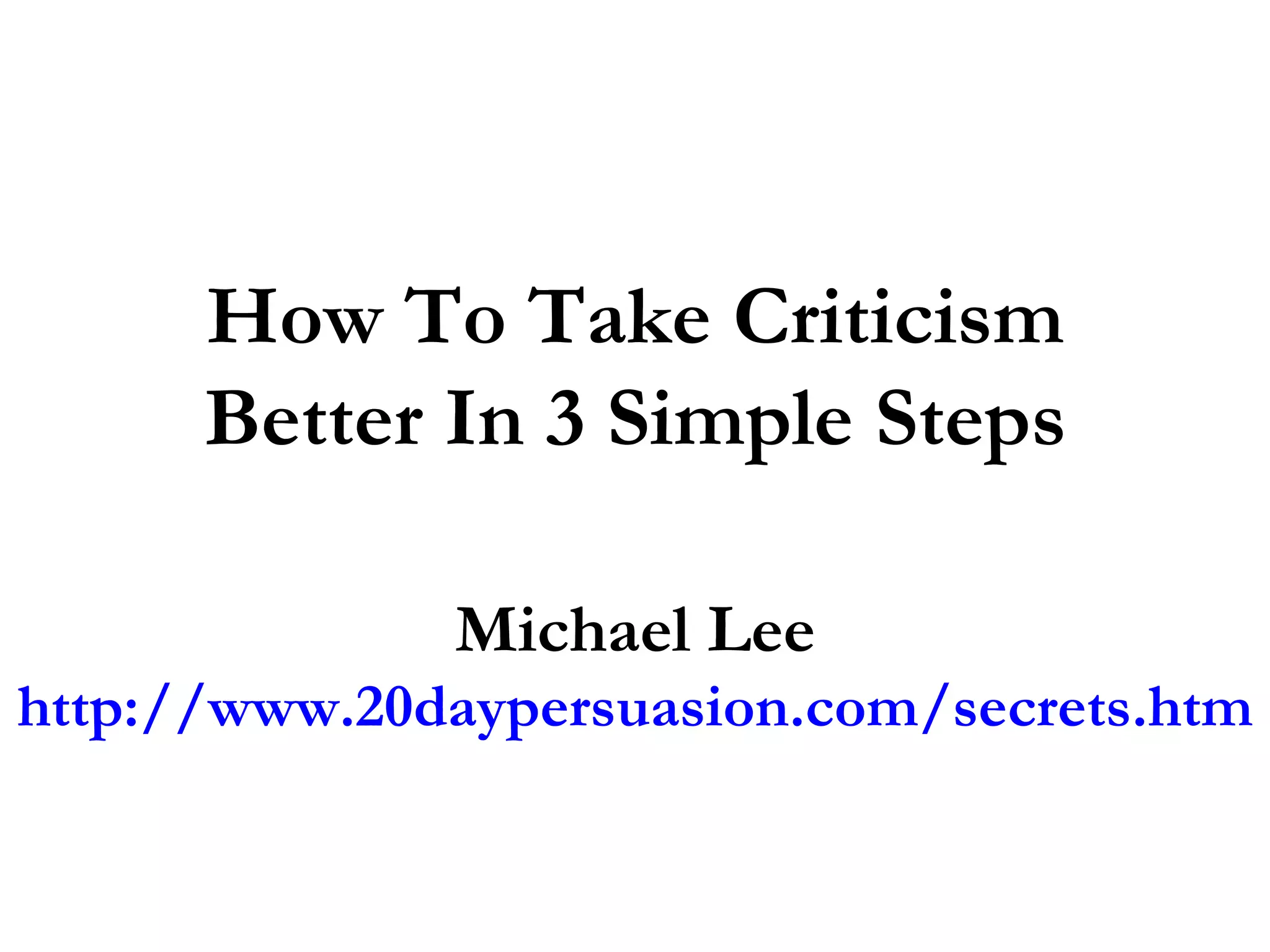 The document outlines a three-step approach by Michael Lee for effectively handling criticism: brace yourself to accept feedback, focus on areas for improvement, and avoid negative thoughts. It emphasizes the importance of seeing criticism as a learning opportunity rather than a personal attack. By adopting this mindset, individuals can develop a stronger ability to grow professionally.