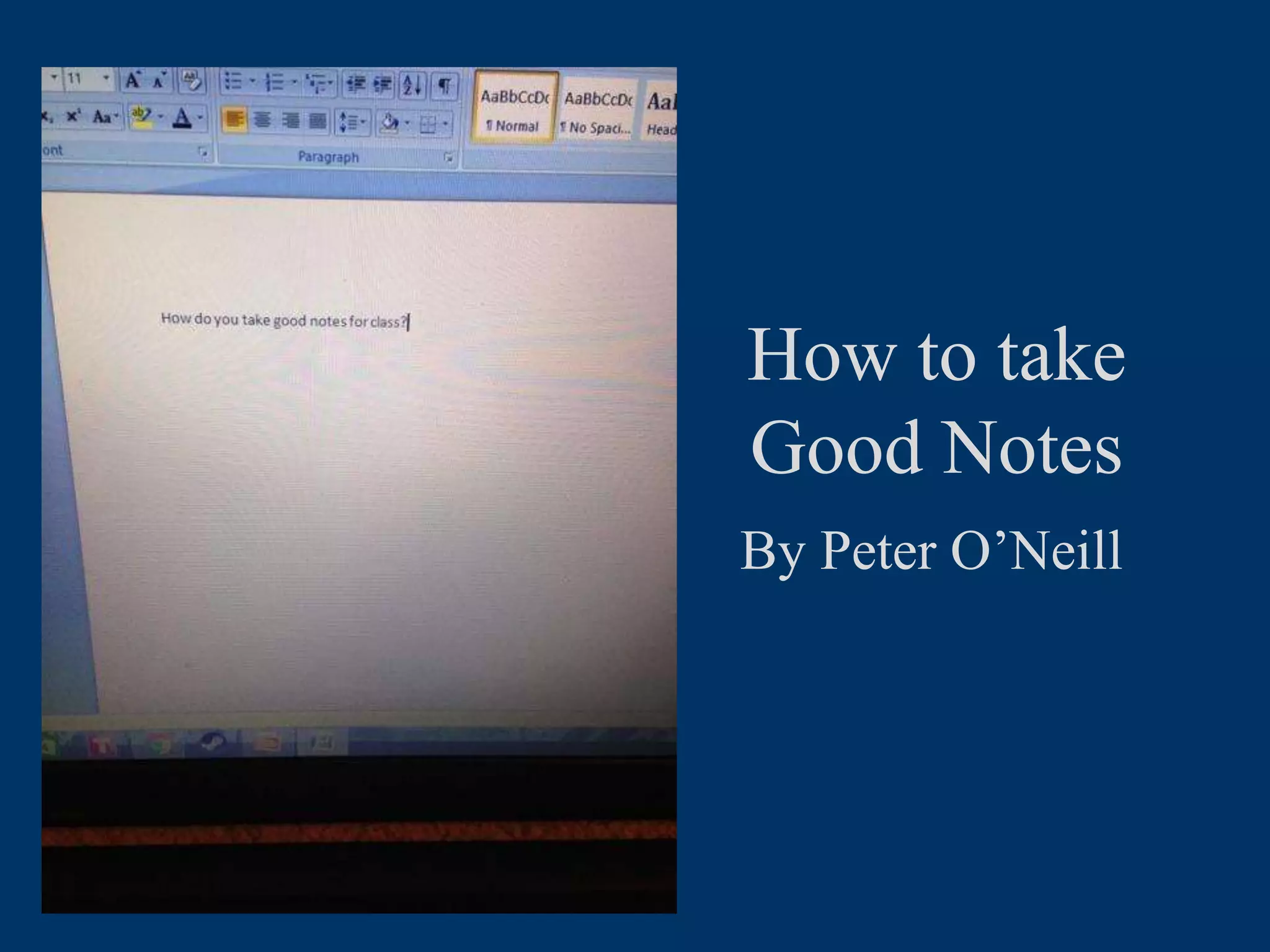 The document provides tips for taking good notes in class. It recommends opening Microsoft Word or another note-taking application on computers allowed in class. It emphasizes the importance of paying attention in class in addition to the physical act of taking notes. Taking notes by hand or using a desktop computer are also options mentioned.