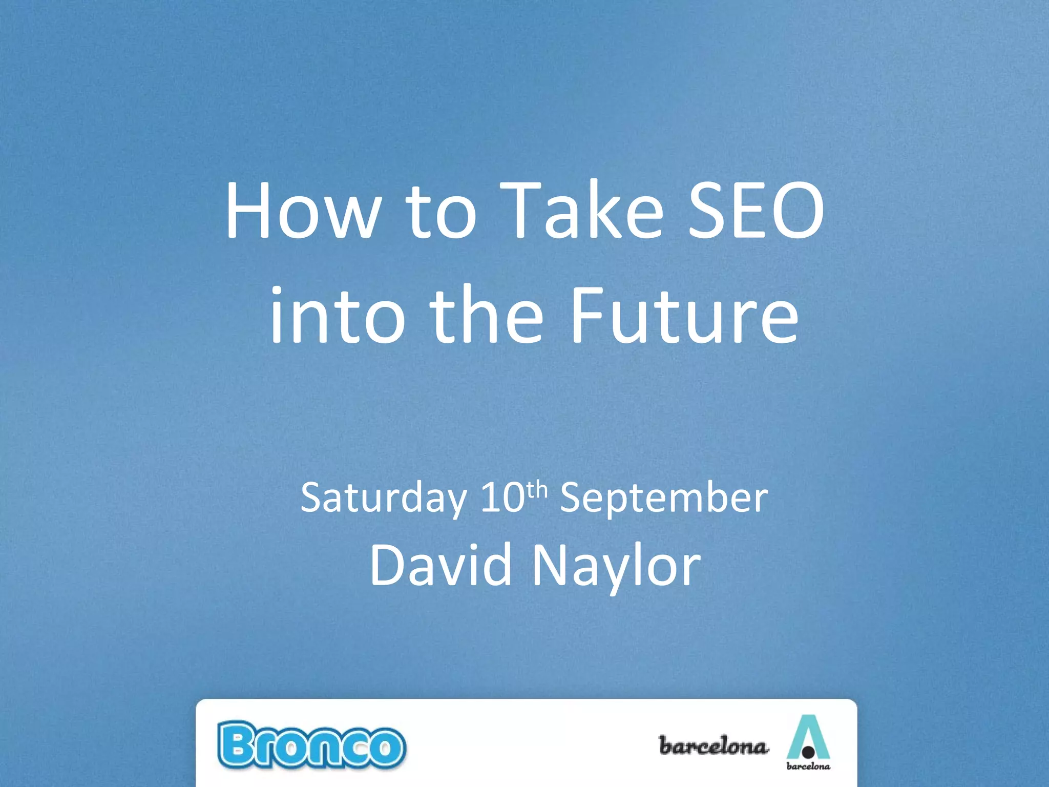 The document discusses SEO best practices for the future. It recommends taking a holistic approach using many techniques to build brand, dominate first page real estate, and build strong communities through user interaction. Specific techniques mentioned include creating unique, high quality content for Google News, Google Shopping, videos/images, reviews/user-generated content, social media, and affiliate programs. The document also stresses the importance of ongoing learning, traditional on-page SEO, social media engagement, finding the right strategy for your sector, and creating good content.