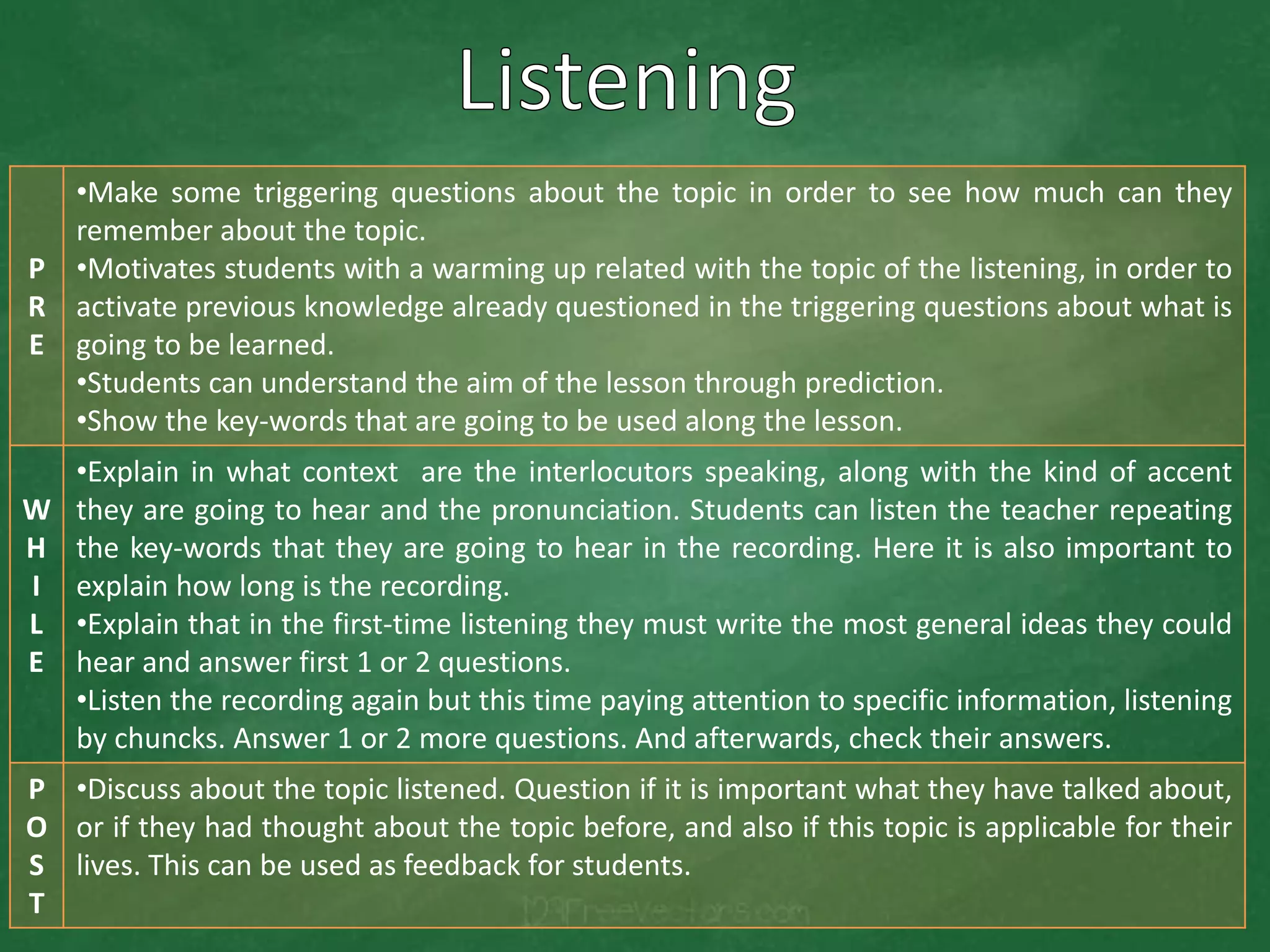 The document outlines a lesson plan template with three main sections: pre, while, and post. In the pre section, the teacher prepares students by asking questions to activate prior knowledge and introduce keywords. During the while section, students engage with a text or activity, such as a listening exercise, reading, or group discussion. In the post section, students reflect on what they learned and the teacher provides feedback. The template is intended to be adapted for lessons involving different skills and topics.