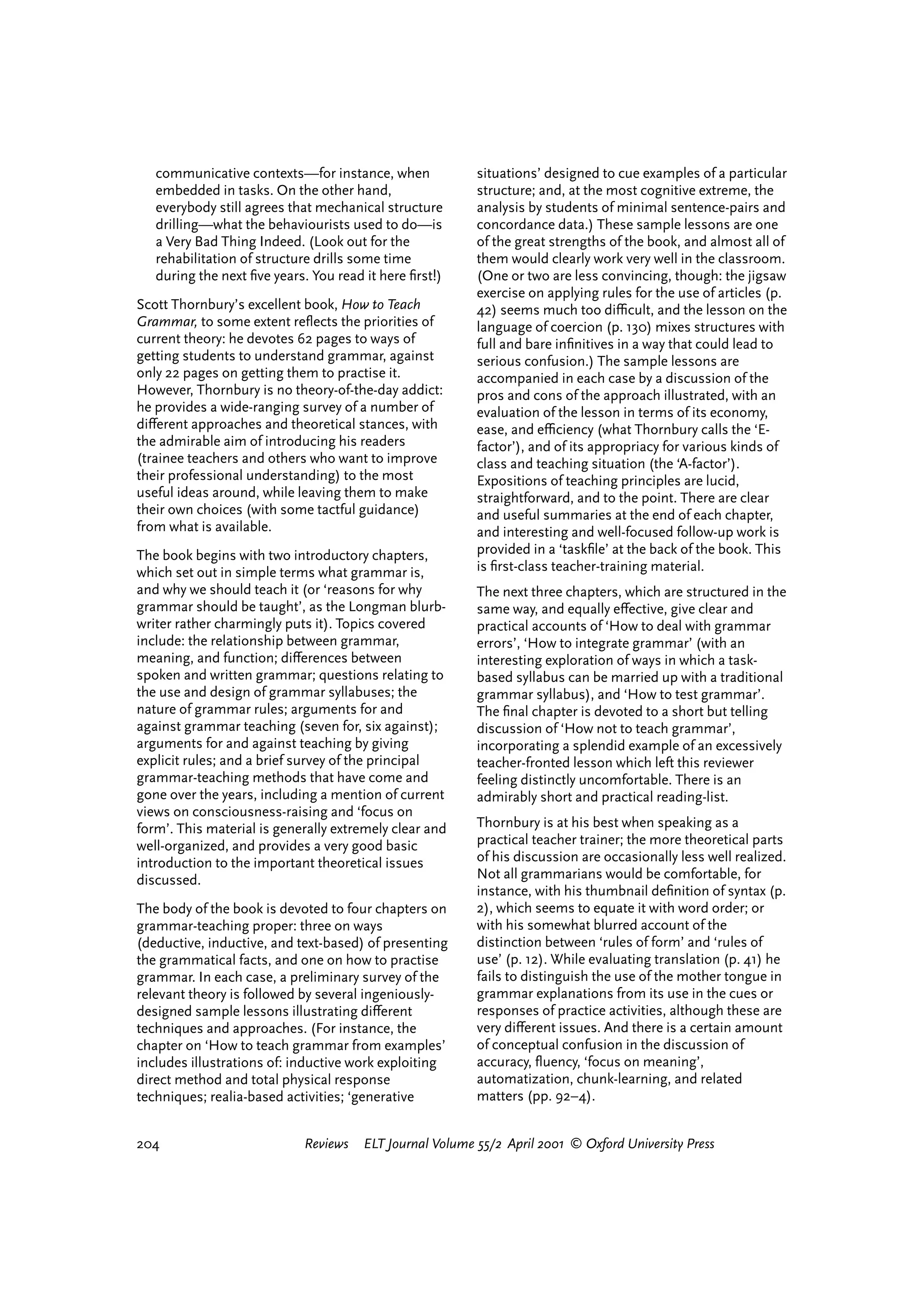 Thornbury's book reflects current theory by focusing more on helping students understand grammar rather than practice it. It provides sample lessons illustrating different teaching techniques and approaches. While generally clear, the book could benefit from a more critical presentation of some theoretical ideas. Parrott's book is concerned only with the "what" of grammar teaching, providing chapters on word classes, verbs, and complex sentences to help teachers develop their grammatical knowledge and reference grammar points in lessons.