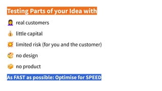 The document outlines strategies for testing a business idea with real customers while minimizing risk and investment. It emphasizes the importance of quick iterations, customer feedback, and using tools like landing pages and usability tests to assess demand. Additionally, it advises that an MVP should be acceptable even if it feels imperfect at launch.