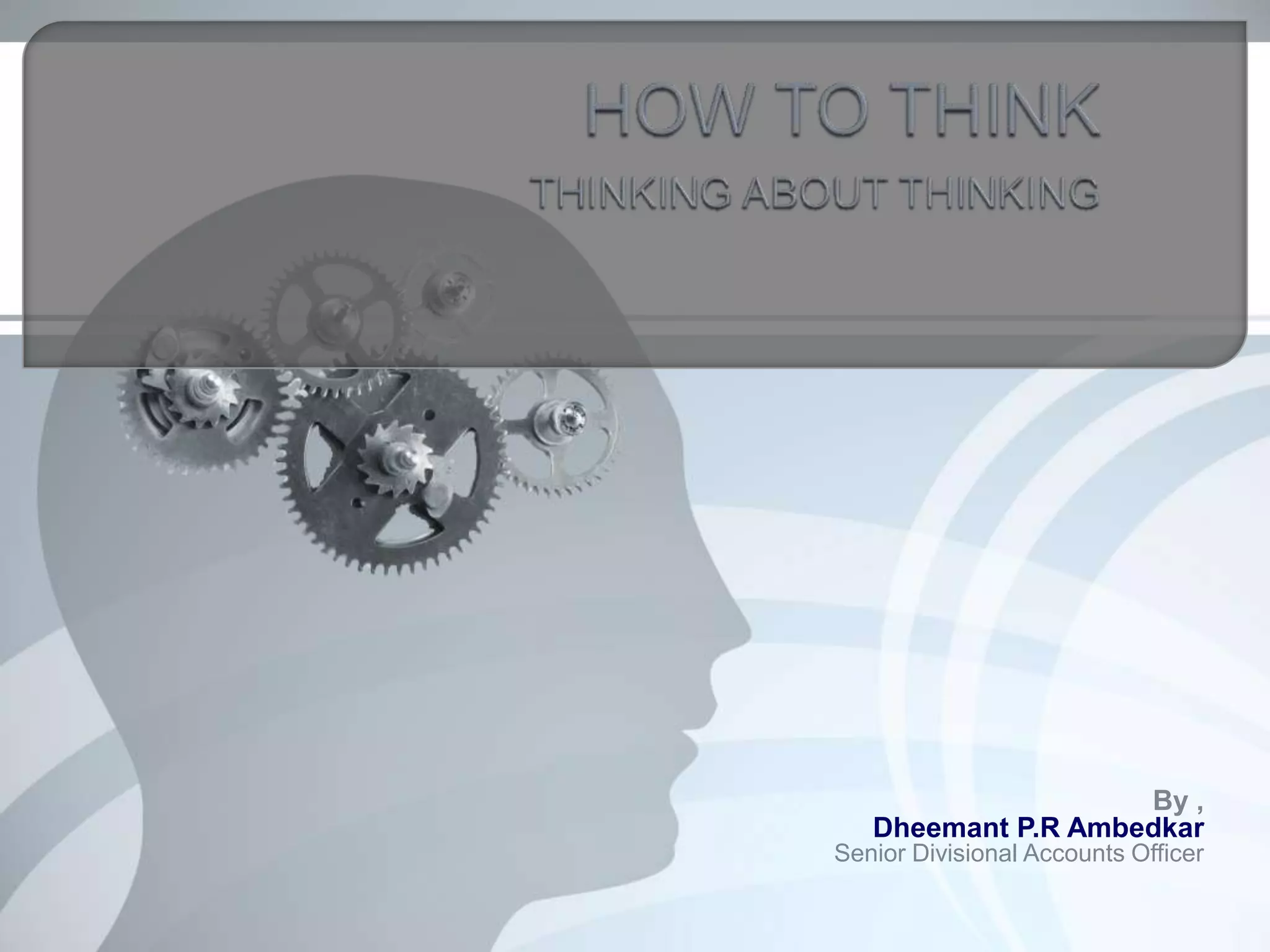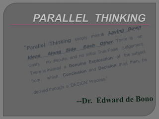 The document discusses different aspects of thinking and approaches to thinking. It introduces Edward de Bono's Six Thinking Hats technique for structured thinking. The Six Hats include the White Hat for neutral facts, Red Hat for emotions, Black Hat for logical negatives and caution, Yellow Hat for optimism and benefits, Green Hat for creativity, and Blue Hat for organization and control. The document emphasizes that thinking is a skill that can be learned and improved through practice and learning different thinking techniques. It provides examples of how to apply the Six Hats technique to generate different perspectives in a thoughtful discussion.